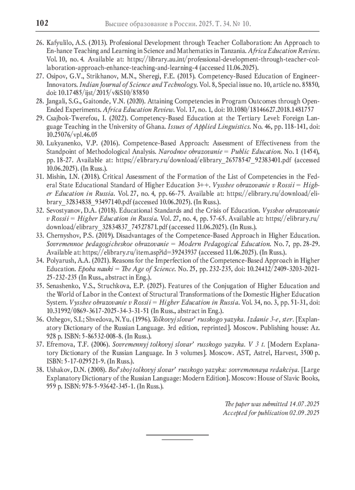 35. Сенашенко В.С., Стручкова Е.П. Особенности сопряжения высшего образования и сферы труда в условиях структурных преобразований отечественной системы высшего образования // Высшее образование в России. 2025. Т. 34. № 3. С. 51-31. DOI: 10.31992/0869-3617-2025-34-3-31-51 EDN: OBSGTD
