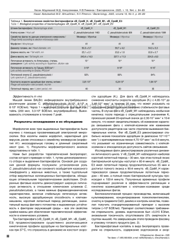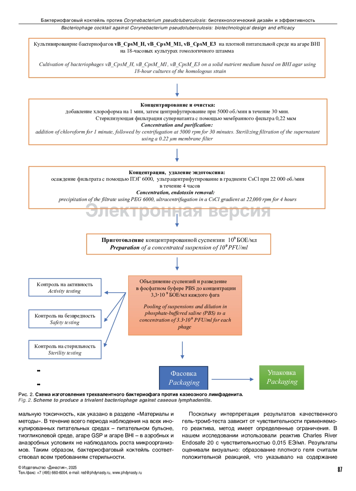 Разработана биотехнология получения трехвалентного коктейля бактериофагов (vB_CpsM_H, vB_CpsM_M1, vB_ CpsM_E3), нацеленного на клинические штаммы Corynebacterium pseudotuberculosis, вызывающие казеозный лимфаденит у овец и коз. После очистки методом осаждения полиэтиленгликолем и ультрацентрифугирования в градиенте хлорида цезия у исследованных фагов были выявлены вариабельные кинетические параметры адсорбции (K0 = 1,64– 6,24·10-8 мл/мин) и латентные периоды (30–40 мин), а также выраженная литическая активность (минимальное ингибирующее разведение – 1:256). В моделях на мышах коктейль обеспечил 75%-ю выживаемость при низкой бактериальной нагрузке (6·104 КОЕ/мл), но при более высокой нагрузке патогена его эффективность снижалась. Безопасность подтверждена валидированными протоколами стерильности, уровнем эндотоксина ниже порога обнаружения (<0,015 ЕЭ/мл) и отсутствием аномальной токсичности (0% смертности). Данная биотехнологически оптимизированная форма демонстрирует значительный потенциал в качестве таргетного терапевтического средства против казеозного лимфаденита.