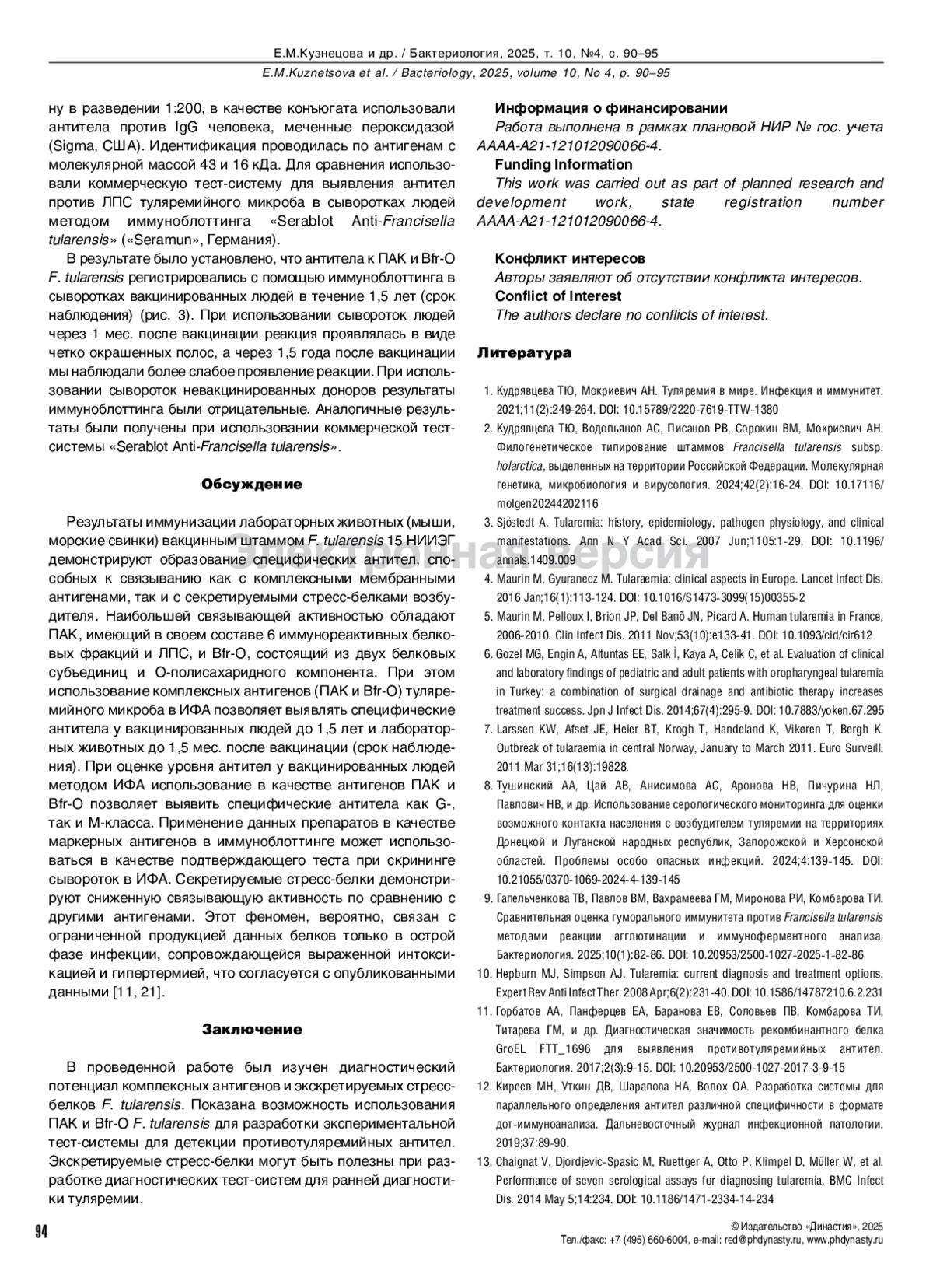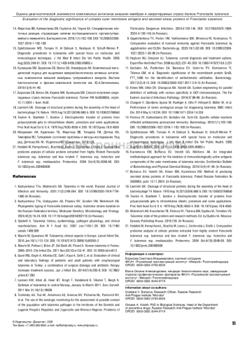 16. Кузнецова ЕМ, Борисова СВ, Волох ОА, Никифоров АК. Комплексный методический подход для выделения иммунобиологически активных антигенных компонентов внешней мембраны туляремийного микроба. Вестник биотехнологии и физико-химической биологии им. Ю.А. Овчинникова. 2019;15(4):41-49.