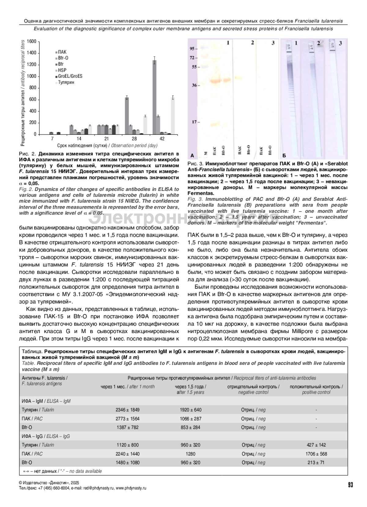 Результаты и обсуждение. Использование комплексных антигенов внешних мембран туляремийного микроба в иммуноферментном анализе (ИФА) позволяет выявлять специфические антитела у вакцинированных людей до 1,5 лет и лабораторных животных до 1,5 мес. после вакцинации (срок наблюдения). При этом в сыворотке вакцинированных людей обнаруживаются специфические антитела класса G и M. Применение комплексных антигенов в иммуноблоттинге может использоваться в качестве подтверждающего теста при скрининге сывороток в ИФА. Полученные стрессбелки обладают более низкой связывающей активностью в ИФА, но позволяют выявлять специфические антитела у вакцинированных лабораторных животных в более ранние сроки.