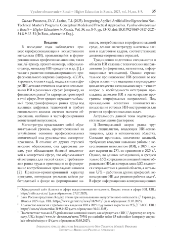 В последние годы наблюдается процесс «профессионализации» искусственного интеллекта (ИИ), проявляющийся в формировании новых профессиональных ниш, таких как AI-тренер, промпт-инженер, нейроиллюстратор, менеджер ИИ-продуктов и др. [1], а также в развитии специализированного профессионального жаргона (например, «LLM», «промпт», «токен» и др.), кодекса этики в сфере ИИ1, а также этических кодексов использования ИИ в различных сферах (например, на финансовом рынке) и карьерных траекторий в этой сфере. Этот процесс отражает глобальный тренд трансформации рынка труда под влиянием цифровых технологий и требует специального анализа системы высшего образования, особенно в части формирования компетенций выпускников.