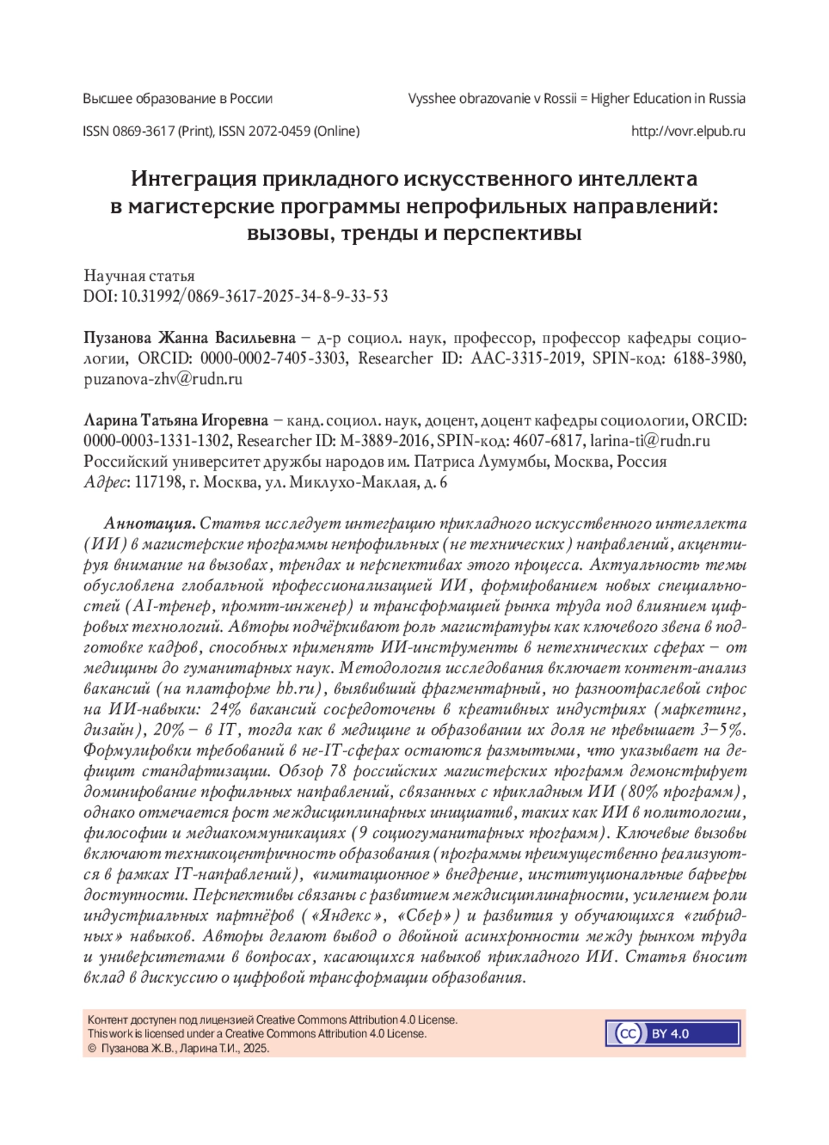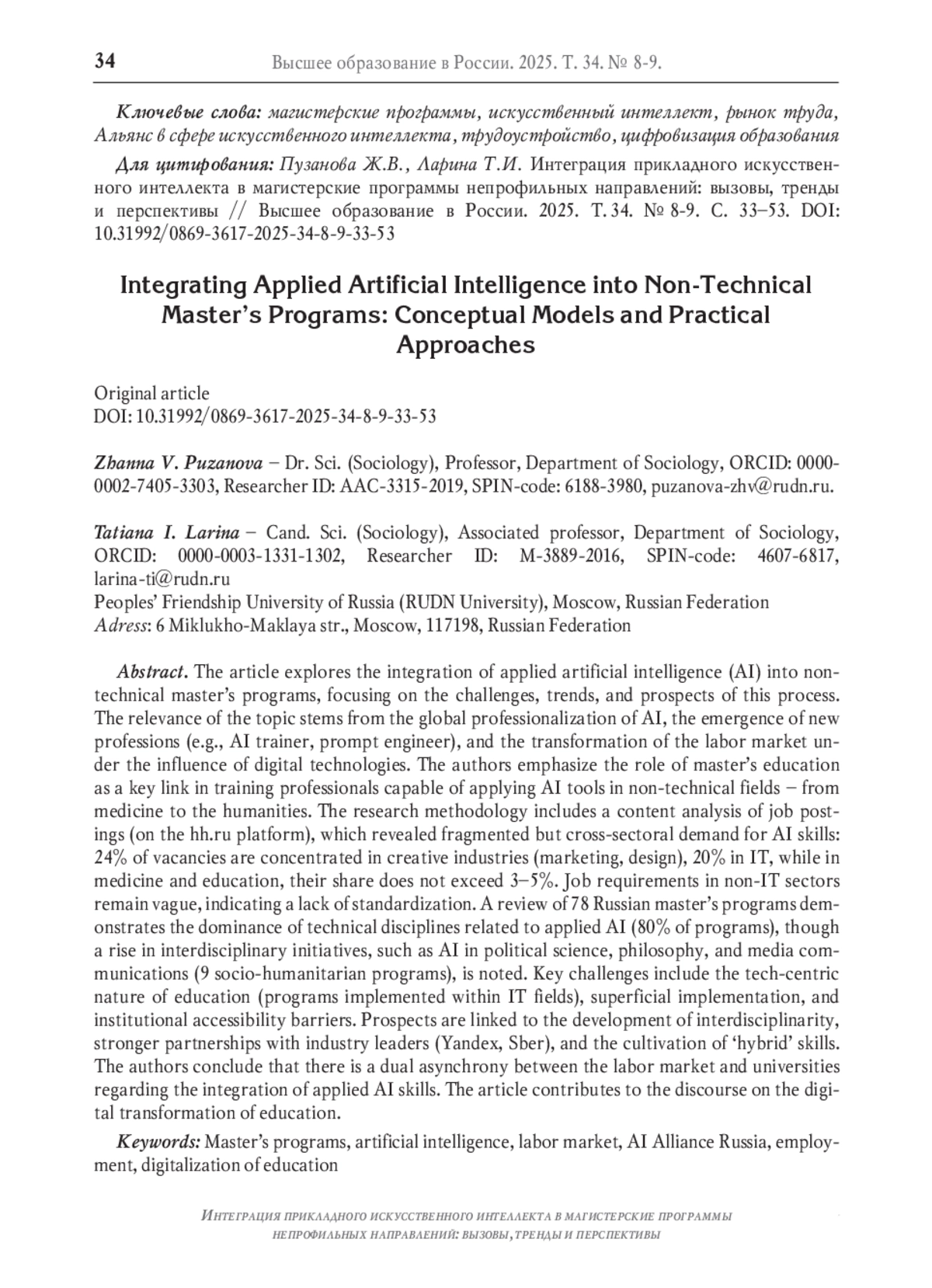 Статья исследует интеграцию прикладного искусственного интеллекта (ИИ) в магистерские программы непрофильных (не технических) направлений, акцентируя внимание на вызовах, трендах и перспективах этого процесса. Актуальность темы обусловлена глобальной профессионализацией ИИ, формированием новых специальностей (AI-тренер, промпт-инженер) и трансформацией рынка труда под влиянием цифровых технологий. Авторы подчёркивают роль магистратуры как ключевого звена в подготовке кадров, способных применять ИИ-инструменты в нетехнических сферах - от медицины до гуманитарных наук. Методология исследования включает контент-анализ вакансий (на платформе hh. ru), выявивший фрагментарный, но разноотраслевой спрос на ИИ-навыки: 24% вакансий сосредоточены в креативных индустриях (маркетинг, дизайн), 20% - в IT, тогда как в медицине и образовании их доля не превышает 3-5%. Формулировки требований в не-IT-сферах остаются размытыми, что указывает на дефицит стандартизации. Обзор 78 российских магистерских программ демонстрирует доминирование профильных направлений, связанных с прикладным ИИ (80% программ), однако отмечается рост междисциплинарных инициатив, таких как ИИ в политологии, философии и медиакоммуникациях (9 социогуманитарных программ). Ключевые вызовы включают техникоцентричность образования (программы преимущественно реализуются в рамках IT-направлений), «имитационное» внедрение, институциональные барьеры доступности. Перспективы связаны с развитием междисциплинарности, усилением роли индустриальных партнёров («Яндекс», «Сбер») и развития у обучающихся «гибридных» навыков. Авторы делают вывод о двойной асинхронности между рынком труда и университетами в вопросах, касающихся навыков прикладного ИИ. Статья вносит вклад в дискуссию о цифровой трансформации образования.