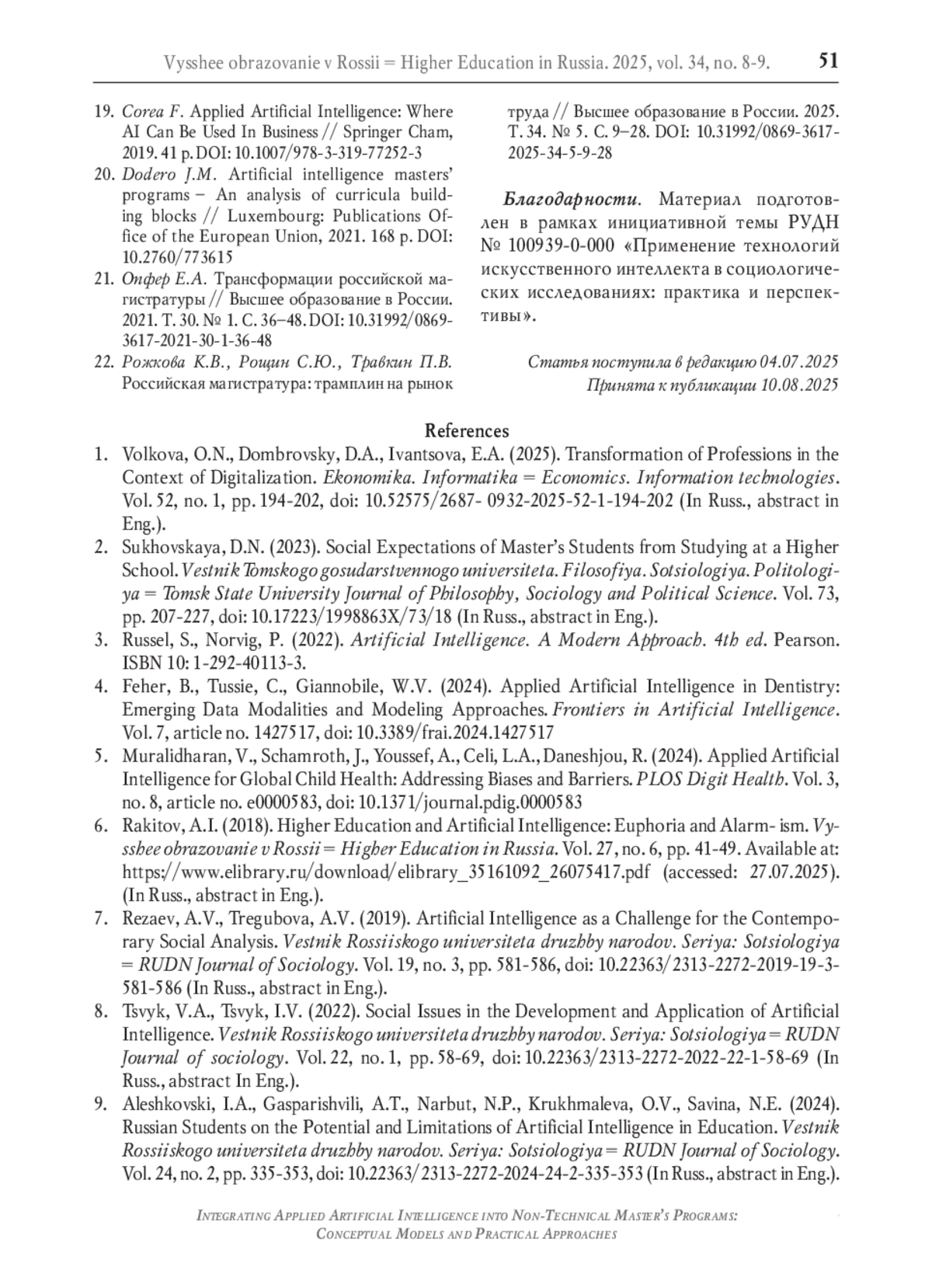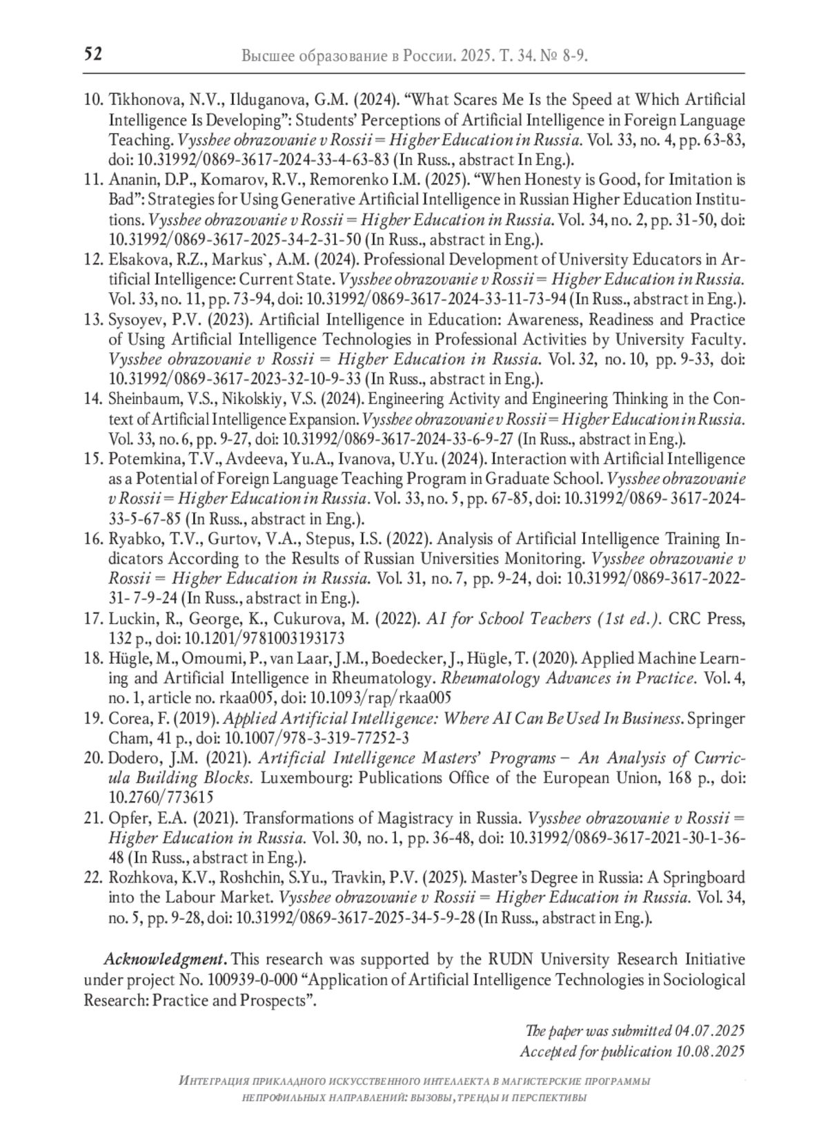 22. Рожкова К.В., Рощин С.Ю., Травкин П.В. Российская магистратура: трамплин на рынок труда // Высшее образование в России. 2025. Т. 34. № 5. С. 9-28. DOI: 10.31992/0869-3617-2025-34-5-9-28 EDN: AZUNBG