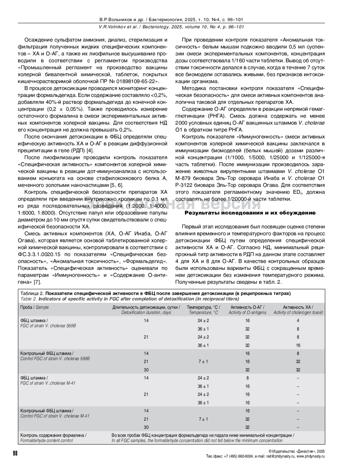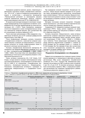 Исследование компонентов по показателю «Специфическая безопасность» выявило, что сокращение длительности детоксикации до 14 суток и увеличение температуры до 24 ± 2°C привело к неполной детоксикации безмикробного центрифугата штамма V. cholerae 569В.
