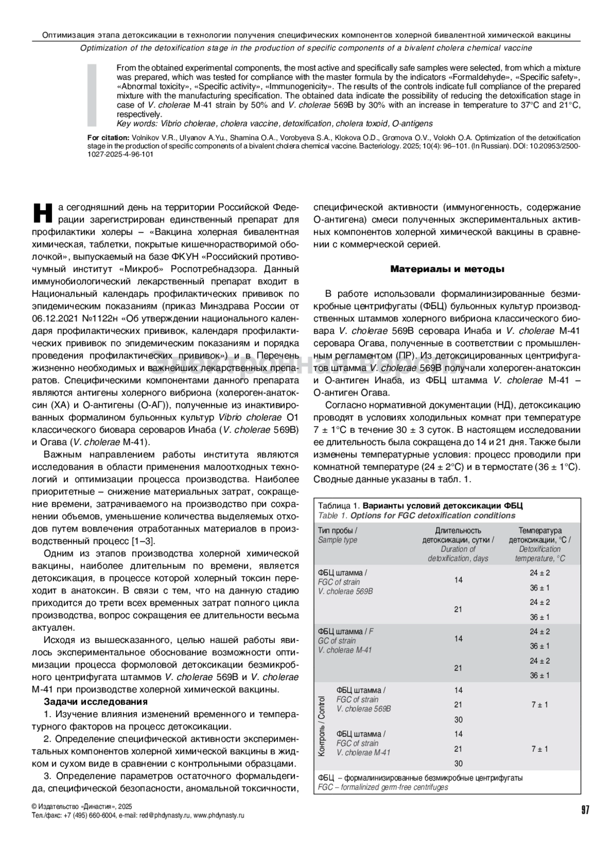 Цель исследования – экспериментально обосновать возможность оптимизации стадии формоловой детоксикации безмикробного центрифугата штаммов Vibrio cholerae 569В и V. cholerae М-41 при производстве холерной химической вакцины. В качестве изменяемых факторов воздействия на процесс детоксикации были выбраны ее длительность и температура, при которой идет процесс. После окончания детоксикации проводили контроль специфической активности и специфической безопасности компонентов вакцины – холероген-анатоксина и О-антигенов. Показатели специфической активности (в реципрокных титрах) в дот-иммуноанализе составляли не менее 8 для холероген-анатоксина, 32 – для О-антигена Инаба, 160 – для О-антигена Огава, что соответствовало нормативной документации.