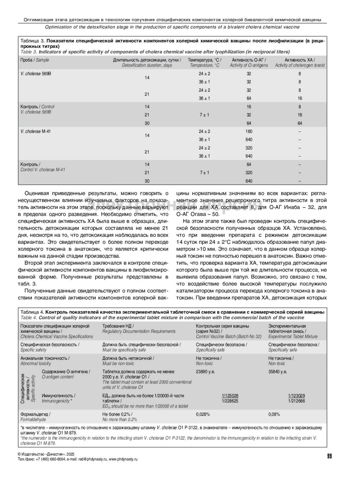 Из полученных компонентов вакцины были выбраны наиболее активные и специфически безопасные образцы, из них была приготовлена экспериментальная таблеточная смесь, которая была проверена на соответствие промышленному регламенту на производство по показателям «Формальдегид», «Специфическая безопасность», «Аномальная токсичность», «Специфическая активность», «Иммуногенность». Результаты свидетельствуют о полном соответствии изученных свойств приготовленной смеси промышленному регламенту. Полученные данные свидетельствуют о возможности сокращения стадии детоксикации у штамма V. cholerae М-41 на 50% и V. cholerae 569В на 30% при повышении температуры до 37°C и 21°C соответственно.