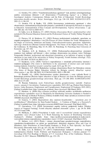 12. Сорокин П.С. “Трансформирующая агентность” как предмет социологического анализа: современные дискуссии и роль образования // Вестник Российского университета дружбы народов. Серия: Социология. 2021. Т. 21, № 1. С. 124-138. DOI: 10.22363/2313-2272-2021-21-1-124-138 EDN: WOXORG