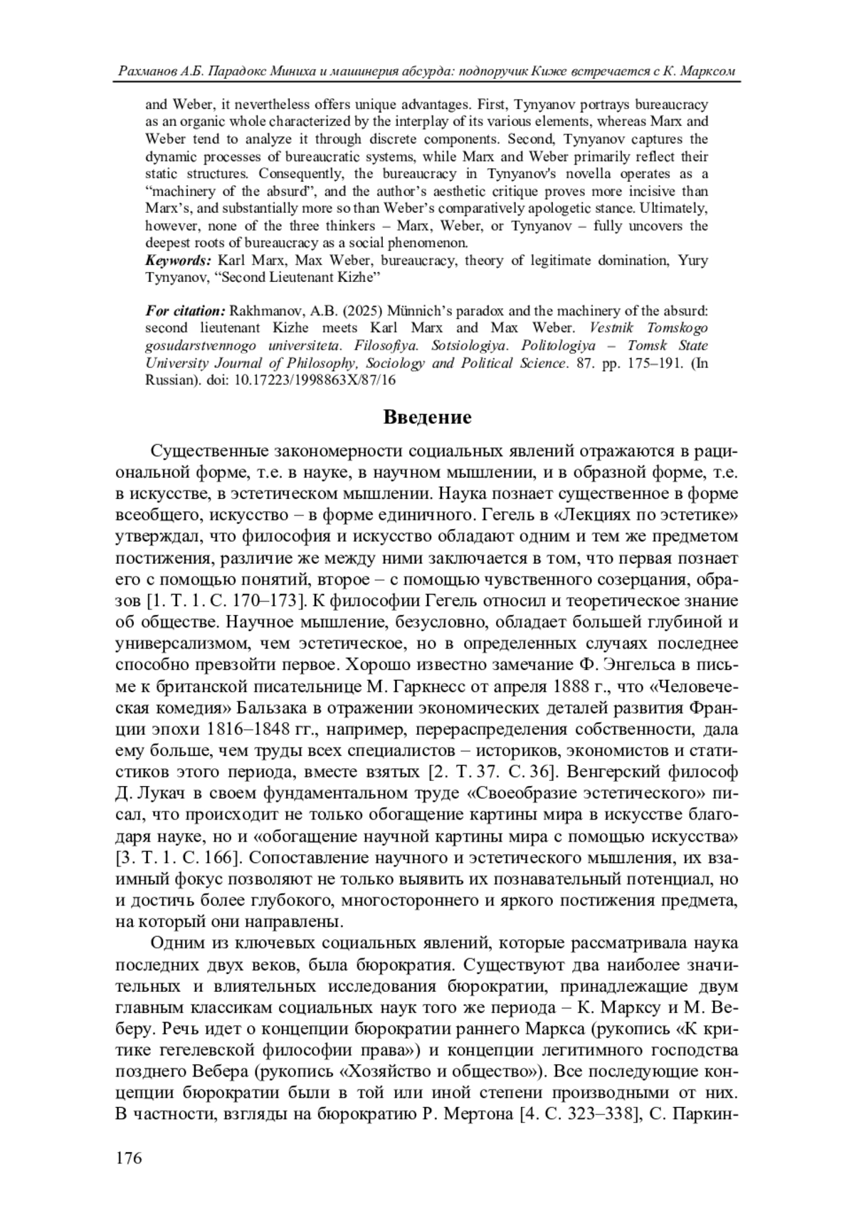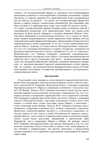 В статье повесть советского писателя Ю. Н. Тынянова «Подпоручик Киже» впервые в отечественной и мировой научной литературе анализируется с помощью концепции бюрократии К. Маркса и концепции легитимного господства М. Вебера. Это позволяет не только более глубоко понять сюжет повести и сделать наглядным, визуализировать содержание концепций двух великих социальных теоретиков, но и обнаружить ситуативное преимущество эстетического мышления над научным мышлением.