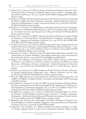 39. Галлямова А.Р., Карачева Е.А. Профессиональные и личностные качества современного преподавателя иностранного языка как ключевой фактор гуманистического образования // Вопросы методики преподавания в вузе. 2024. Т. 13. № 1. С. 117-129. DOI: 10.57769/2227-8591.12.1.08 EDN: FNTYOE