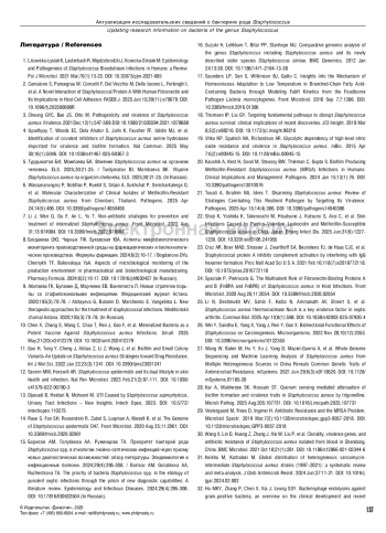 15. Борисов АМ, Голубкова АА, Руженцова ТА. Приоритет бактерий рода Staphylococcus spp. в этиологии гнойно-септических инфекций через призму новых диагностических возможностей: обзор литературы. Эпидемиология и инфекционные болезни. 2024;29(4):295-308.