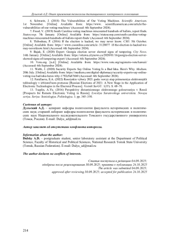 12. Фатуллаева Э.А. Российские выборы 2021 года: новый этап применения электронных технологий в избирательном процессе // Вестник СурГУ. 2022. № 1 (35). С. 69-78.