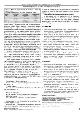5. Соломенцева АЕ, Карпова ЕВ, Фурсов МВ, Волков ДВ, Кисличкина АА, Шишкина ЛА, и др. Геномы штаммов Klebsiella pneumoniae, выделенных от пациентов многопрофильных стационаров в Республике Беларусь в 2016- 2022 гг. Бактериология. 2025;10(2):74-78.