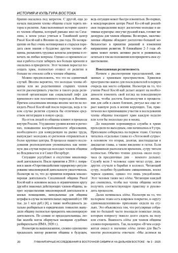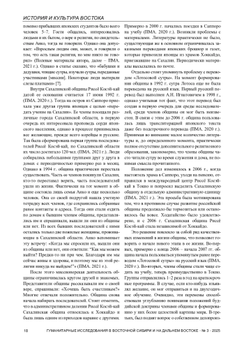 Статья посвящена исследованию истории и современного состояния японской буддийской организации Риссё Косэй-кай на Сахалине. На основе полевых материалов автор реконструирует процесс формирования общины, начавшийся в 1992 г. с визита японских миссионеров, и выделяет ключевые вехи ее институционализации, среди которых - получение административной независимости от японского центра в 2006 г. и обретение собственного храма в 2012 г. В работе анализируются внешние и внутренние вызовы, с которыми сталкивается община на современном этапе: старение и сокращение численности последователей, законодательные ограничения миссионерской деятельности в России, влияние пандемии COVID-19. Автор отмечает гибкость и адаптивность сообщества верующих, успешно перешедшего на онлайн-формат проведения хōдза и учебных семинаров, что позволило сохранить групповую идентичность и межличностные связи.