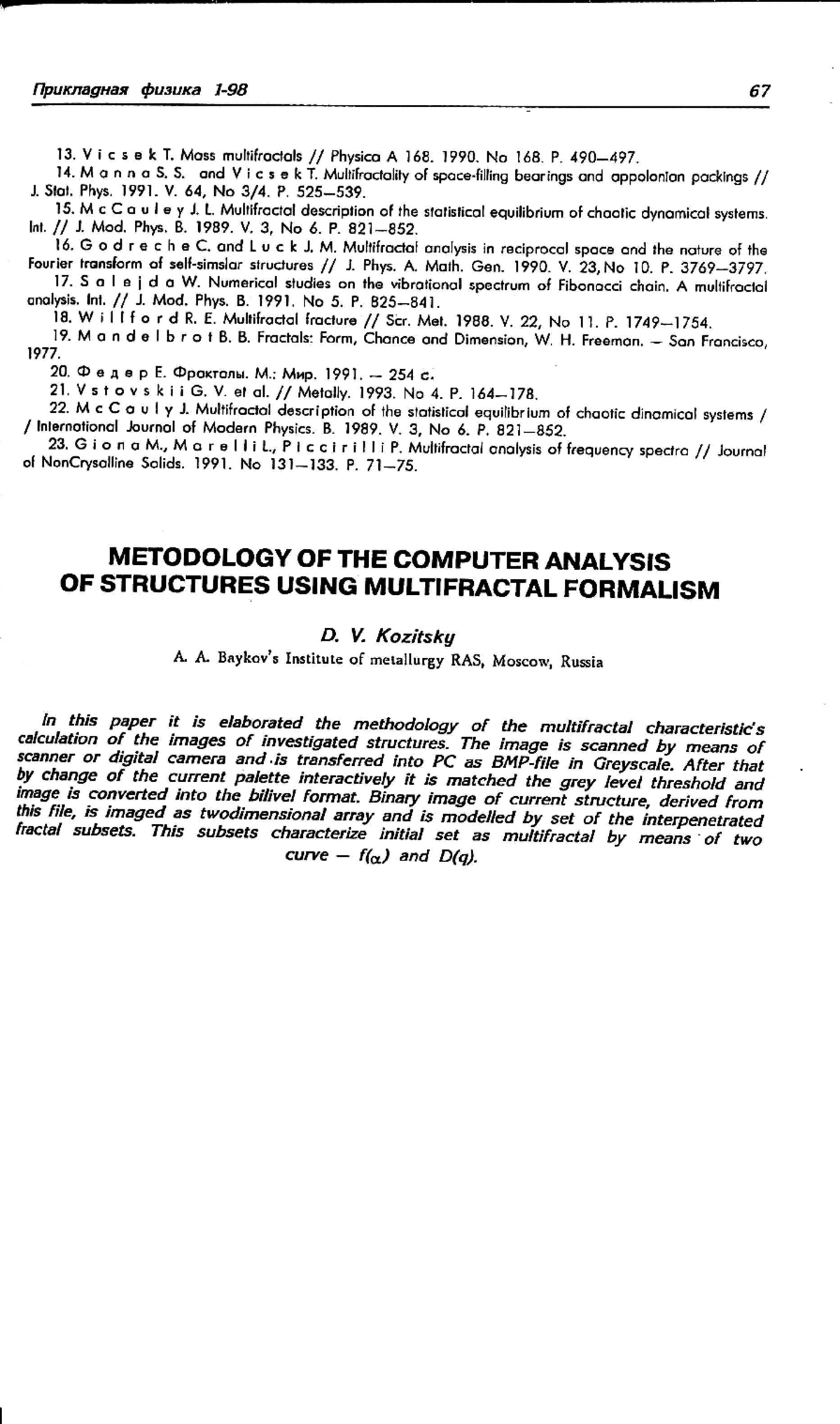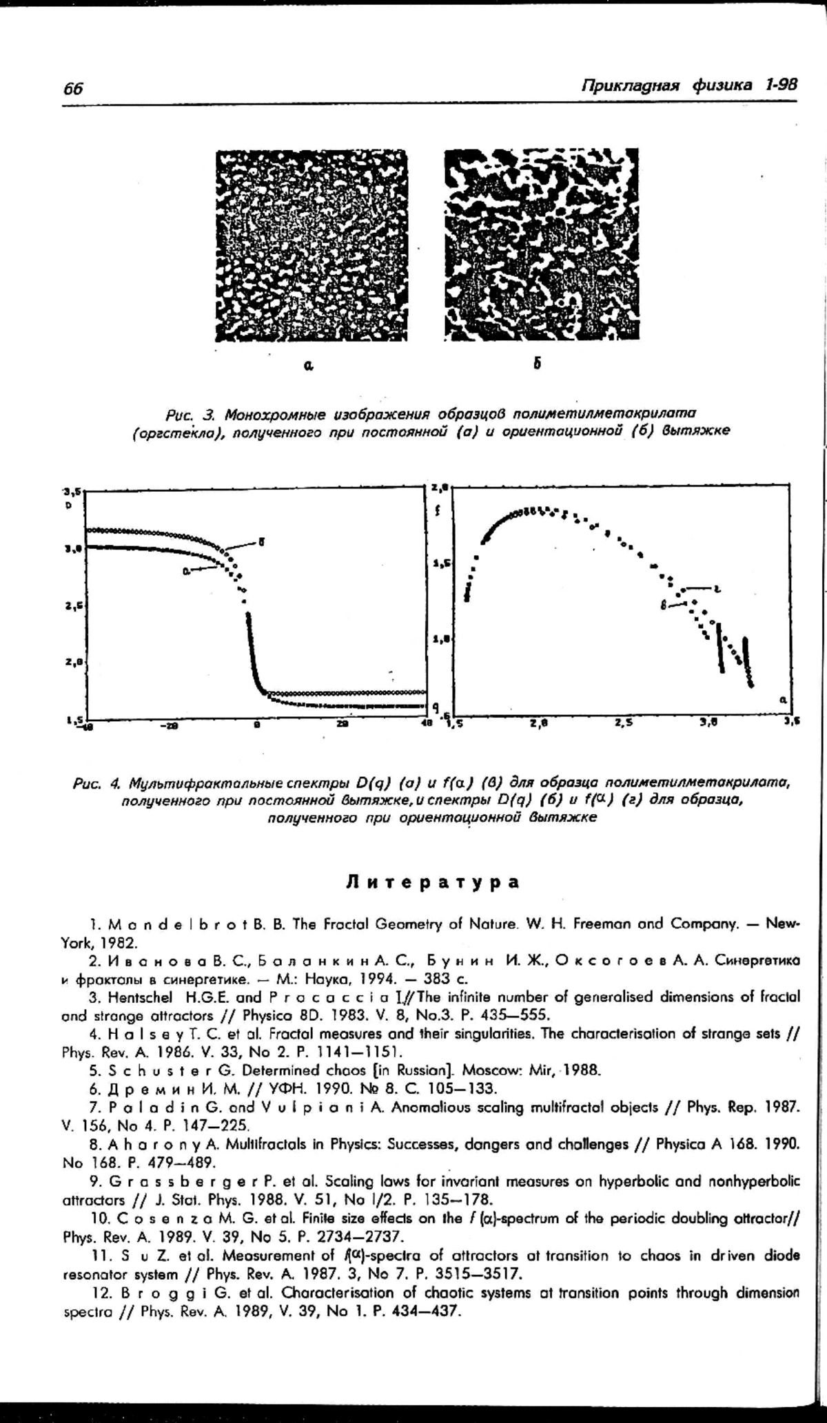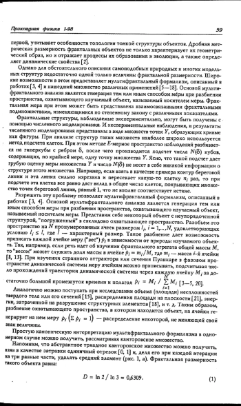 C использованием концепции мультифрактального формализма разработана методика расчета мультифрактальных характеристик изображений исследуемых структур. Изображение сканируется с помощью сканера или цифровой видеокамеры и передается в компьютер в виде файла в графическом формате ВМР (256 оттенков серой шкалы). Далее изменением текущей палитры интерактивно подбирается пороговое значение уровня серого, при котором данное изображение переводится в монохромный формат. После этого образ изображения копируется с экрана в оперативную память, представляется в виде двоичного массива и моделируется набором взаимопроникающих фрактальных подмножеств, на основе которых рассчитываются две зависимости, описывающие исходное множество как мультифрахтал - спектр сингулярностей f(α) и спектр размерностей Реньи D(q)