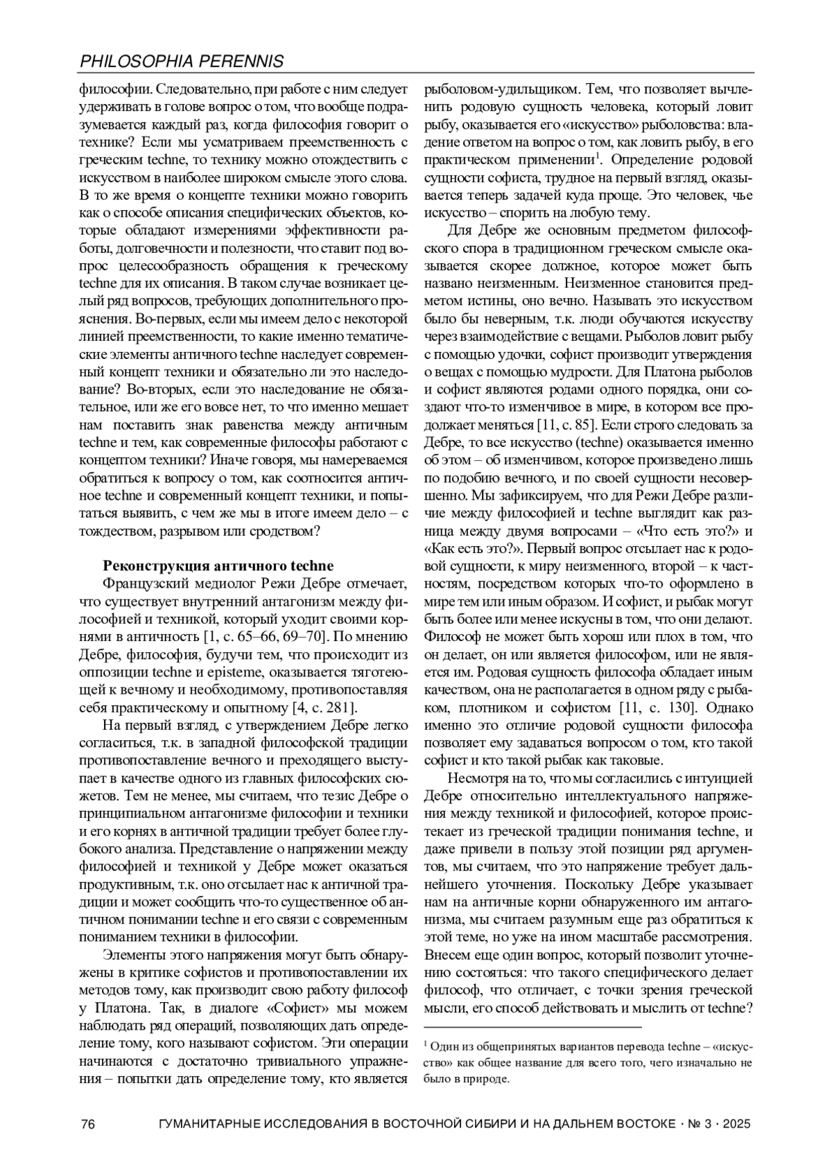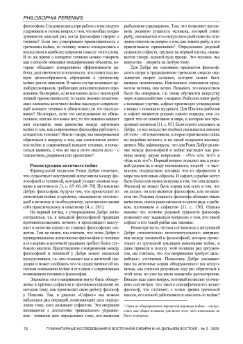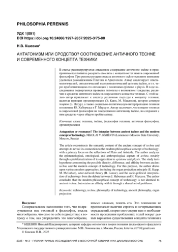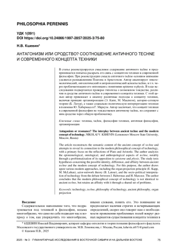 В статье реконструируется смысловое содержание античного techne и предпринимается попытка раскрыть его связь с концептом техники в современной философии. При реконструкции смысла античного techne основное внимание уделяется размышлениям Платона и Аристотеля. Автор анализирует эпистемологический, онтологический и антропологический аспекты techne, в т. ч. через проблематизацию его оппозиции с понятиями episteme и physis. В ходе исследования подвергаются проверке гипотезы о возможном тождестве, различии и сродстве античного techne и современного концепта техники. С этой целью автор привлекает к анализу различные подходы к концепту техники, включая принцип органопроекции (Э. Капп, М. Маклюэн), акторно-сетевую теорию (Б. Латур), а также социально-политическую интерпретацию техники в полемике Ю. Хабермаса и Г. Маркузе. Автор заключает, что концепт техники в современной философии не тождественен античному techne, но сохраняет с ним сродство через общую проблематику.