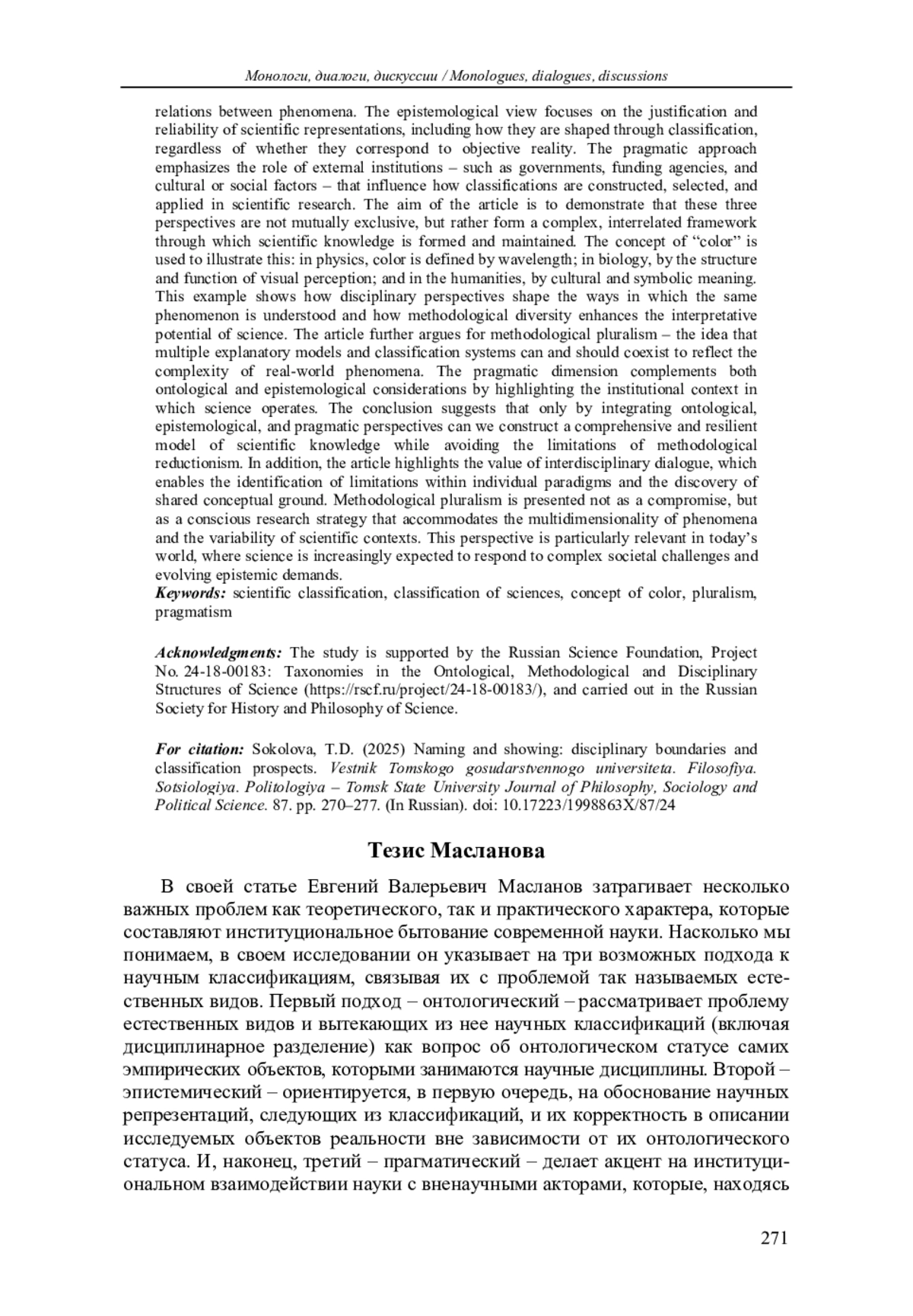 1. Масланов Е. Классифицировать и измерять: к вопросу об использовании классификаторов науки // Вестник Томского государственного университета. Философия. Социология. Политология. 2025. № 87. С. 230-238. EDN: YQOSXY
