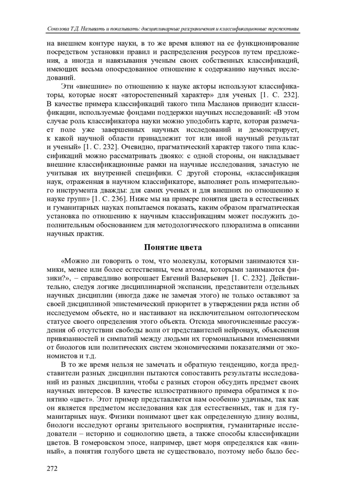 В предлагаемой к дискуссии статье Е. В. Масланов затрагивает, на наш взгляд, три важные для философии проблемы научного познания. Первая заключается в соответствии наших классификаций и таксономий «реальному» порядку или модусу существования природных объектов, т. е. представляет собой онтологическую проблему. Вторая носит скорее эпистемологический характер и ставит под вопрос соответствие дисциплинарного разделения научных исследований, с одной стороны, «реальной» природе, а с другой - нашим классификациям. Третья - прагматическая проблема представляет собой своего рода надстройку над первыми двумя и касается институциональной организации научного познания. В настоящей статье мы попробуем представить взаимосвязь этих философских проблем через пример понятия «цвет», которое может выступать и как предмет, и как средство классификации как в естественных, так и в гуманитарных науках, и показать, каким образом прагматический подход к классификациям может быть использован в качестве обоснования методологического плюрализма.