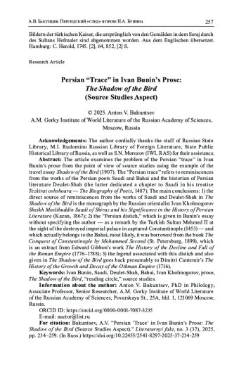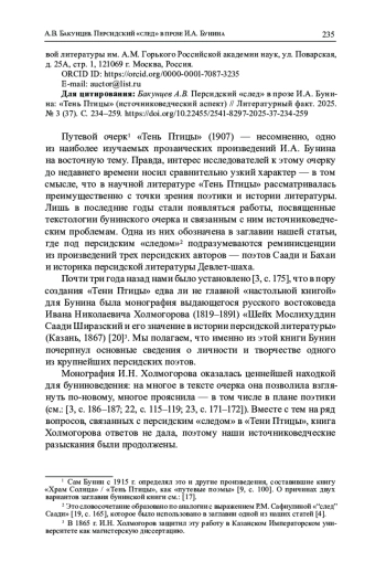 Путевой очерк1 «Тень Птицы» (1907) — несомненно, одно из наиболее изучаемых прозаических произведений И. А. Бунина на восточную тему. Правда, интерес исследователей к этому очерку до недавнего времени носил сравнительно узкий характер — в том смысле, что в научной литературе «Тень Птицы» рассматривалась преимущественно с точки зрения поэтики и истории литературы. Лишь в последние годы стали появляться работы, посвященные текстологии бунинского очерка и связанным с ним источниковедческим проблемам. Одна из них обозначена в заглавии нашей статьи, где под персидским «следом»2 подразумеваются реминисценции из произведений трех персидских авторов — поэтов Саади и Бахаи и историка персидской литературы Девлет-шаха.