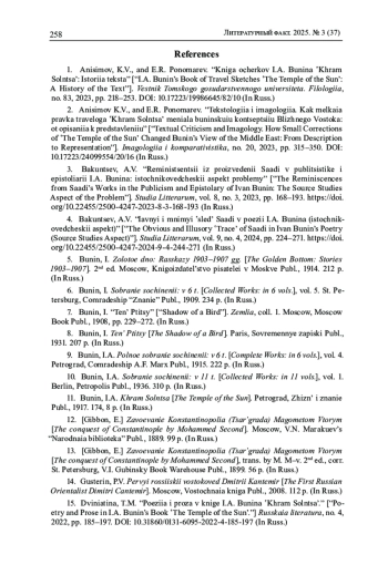 4. Бакунцев А.В. Явный и мнимый “след” Саади в поэзии И.А. Бунина (источниковедческий аспект) // Studia Litterarum. 2024. Т. 9, № 4. С. 244-271. DOI: 10.22455/2500-4247-2024-9-4-244-271 EDN: PXJXBR