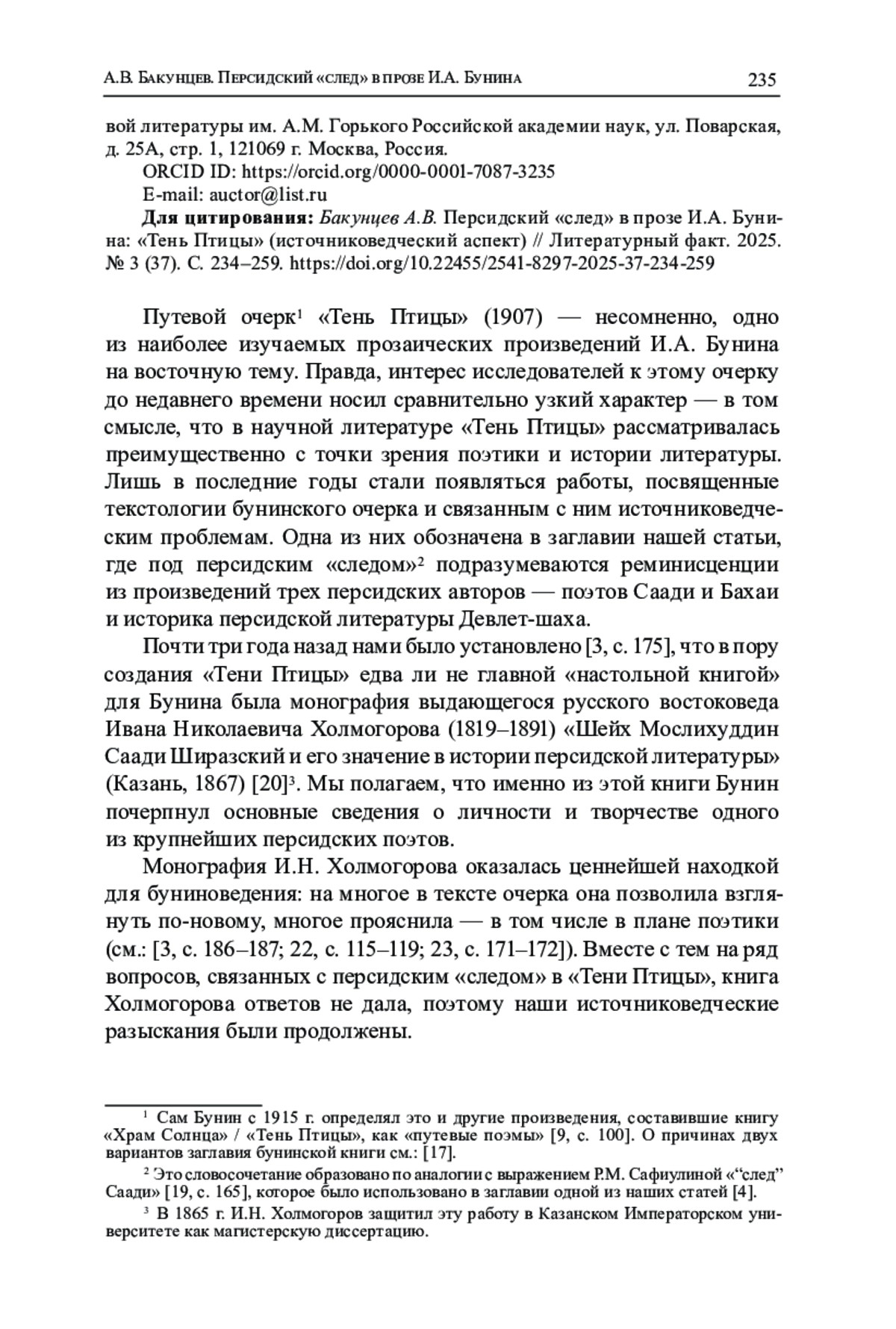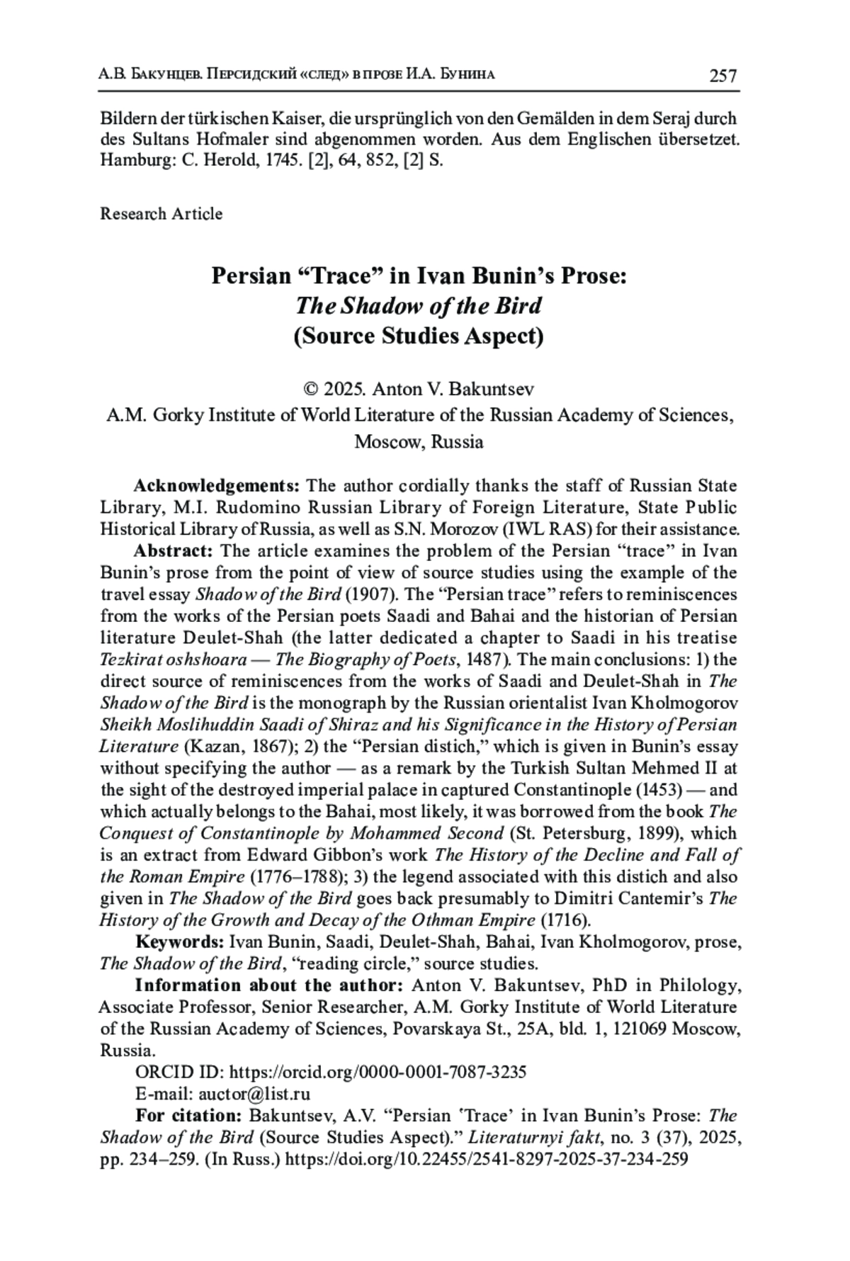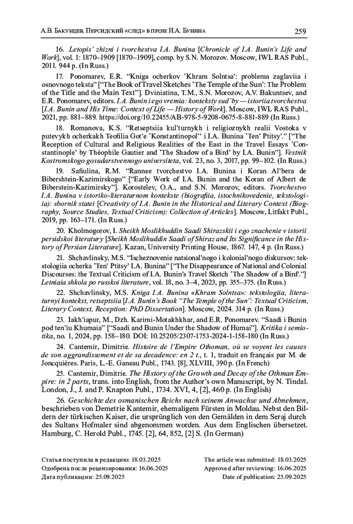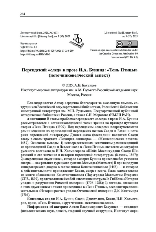 3. Бакунцев А.В. Реминисценции из произведений Саади в публицистике и эпистолярии И.А. Бунина: источниковедческий аспект проблемы // Studia Litterarum. 2023. Т. 8, № 3. С. 168-193. DOI: 10.22455/2500-4247-2023-8-3-168-193 EDN: VESVVM