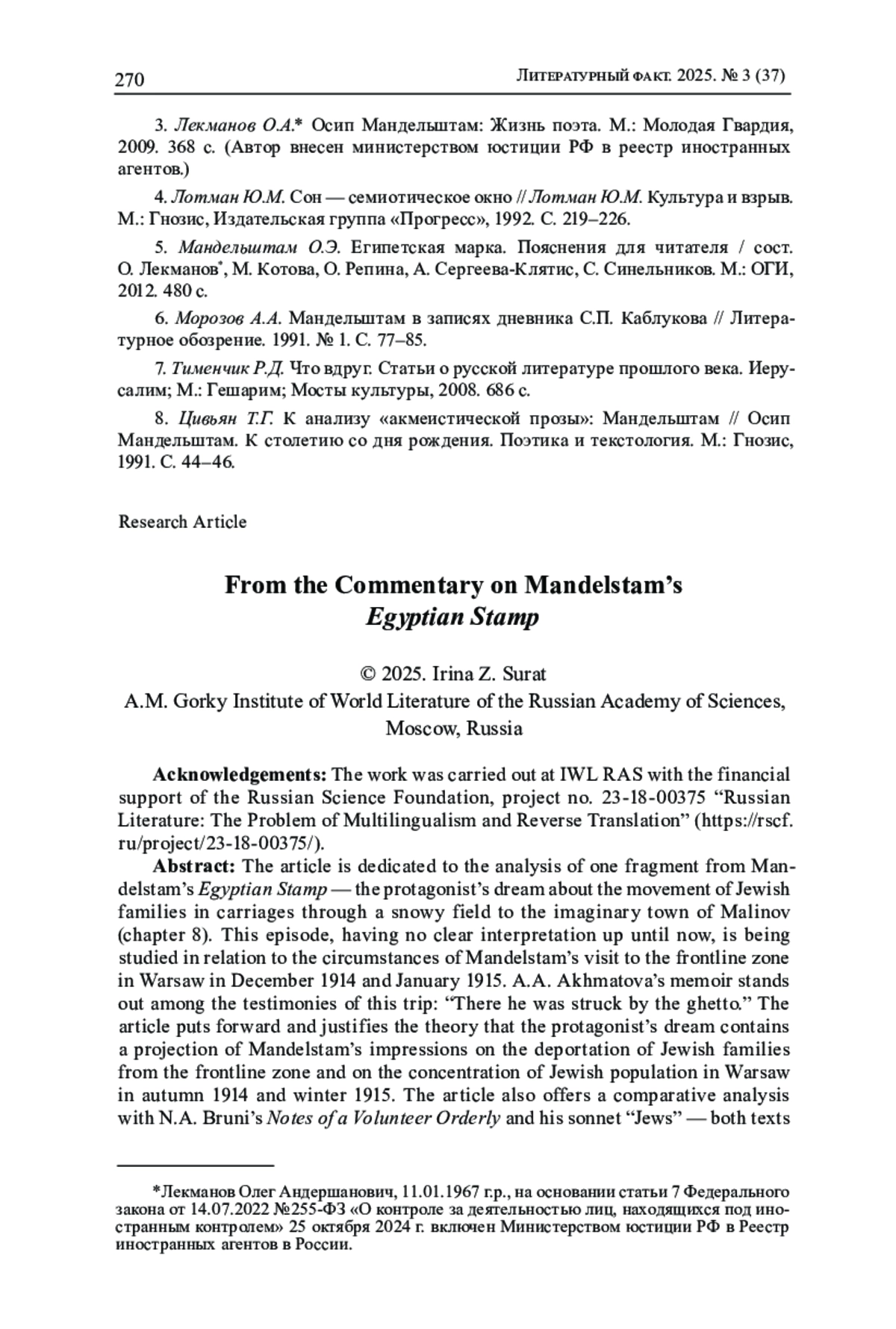 3. Лекманов О.А.* Осип Мандельштам: Жизнь поэта. М.: Молодая Гвардия, 2009. 368 с. (Лекманов Олег Андершанович, 11.01.1967 г.р., на основании статьи 7 Федерального закона от 14.07.2022 №255-ФЗ “О контроле за деятельностью лиц, находящихся под иностранным контролем” 25 октября 2024 г. включен Министерством юстиции РФ в Реестр иностранных агентов в России).