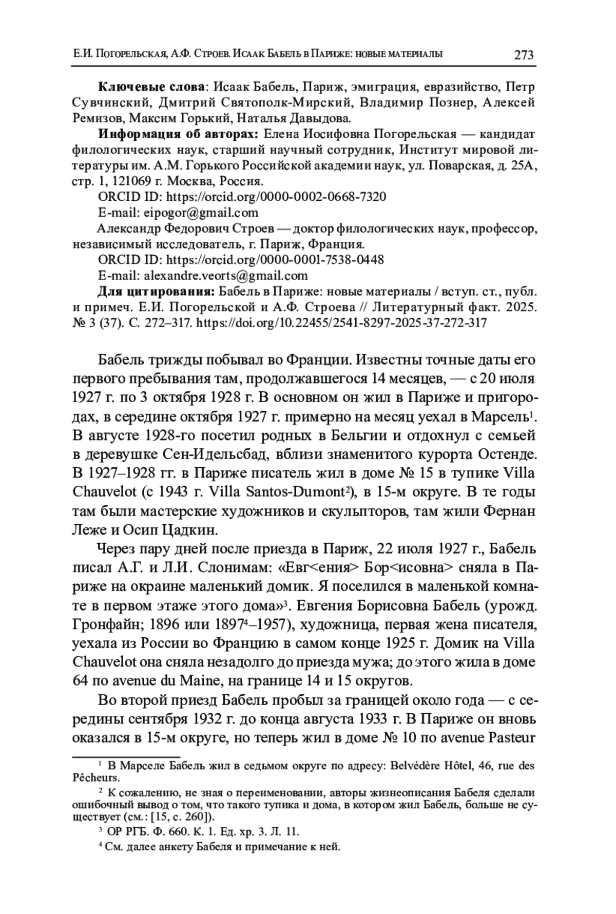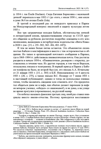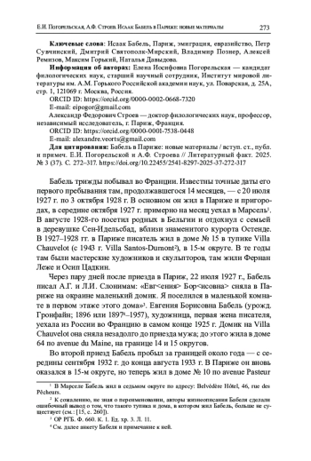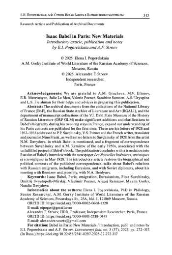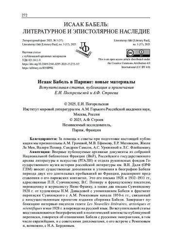Впервые публикуемые архивные документы из собраний Национальной библиотеки Франции (BnF), Российского государственного архива литературы и искусства (РГАЛИ) и отдела рукописных фондов Государственного музея истории российской литературы им. В. И. Даля (ОРФ ГЛМ) вносят существенные дополнения и уточнения в биографию Бабеля периода двух его длительных пребываний во Франции, расширяют представления о его парижских контактах. Это его письма 1928 и 1932-1933 гг., адресованные П. П. Сувчинскому, В. С. Познеру и французскому писателю, переводчику и журналисту Нино Франку, а также два письма Сувчинскому 1928 г. от художницы Н. М. Давыдовой с упоминанием Бабеля и фрагмент переписки Сувчинского с А. М. Ремизовым начала 1950-х гг., связанный с неосуществленным проектом издания сборника Бабеля. Завершает публикацию интервью писателя газете Les Nouvelles littéraires, artistiques et scientifiques в мае 1928 г. в переводе на русский язык. Во вступительной статье восстанавливаются биографический и политический контексты публикуемой переписки, говорится об отношениях Бабеля с русскими эмигрантами, в том числе евразийцами, и с советскими дипломатами, о его встрече с Ремизовым и, возможно, с Н. А. Бердяевым.
