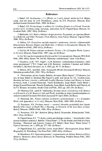 10. Обатнина Е.Р., Вахненко Е.Е. Хроника жизни и творчества А.М. Ремизова. URL: Хроника жизни и творчества А.М. Ремизова (pushkinskijdom.ru) (дата обращения: 07.04.2024).