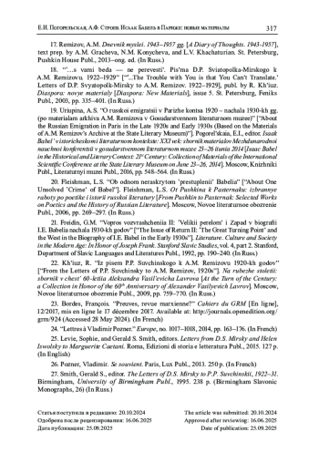 21. Фрейдин Г.М. Вопрос возвращения II: “Великий перелом” и Запад в биографии И.Э. Бабеля начала 1930-х годов // Literature. Culture and Society in the Modern Age: In Honor of Joseph Frank. Stanford Slavic Studies. Stanford: Department of Slavic Languages and Literatures, 1992. Vol. 4, part II. P. 190-240.
