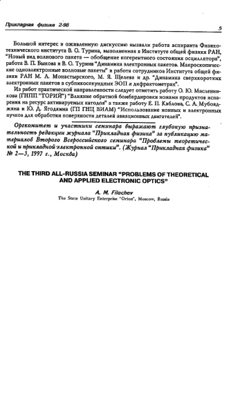 The third All-Russia seminar “Problems of theoretical and applied electronic optics” passed March 31 - April 2, 1998 in Otradnoe (Moscow area). 45 experts have taken part in work of a seminar: the researchers of three institutes of RAS, six research institutes and state centres of science, representatives of the Sumy industrial association “SELMI” and joint-stock company “Krasnogorski` factory”, teachers and post-graduate students of eight higher educational institutes, and also known experts from the Siberian branch of RAS, Nizhniy Novgorod University, Ryazan radio-technical institute.