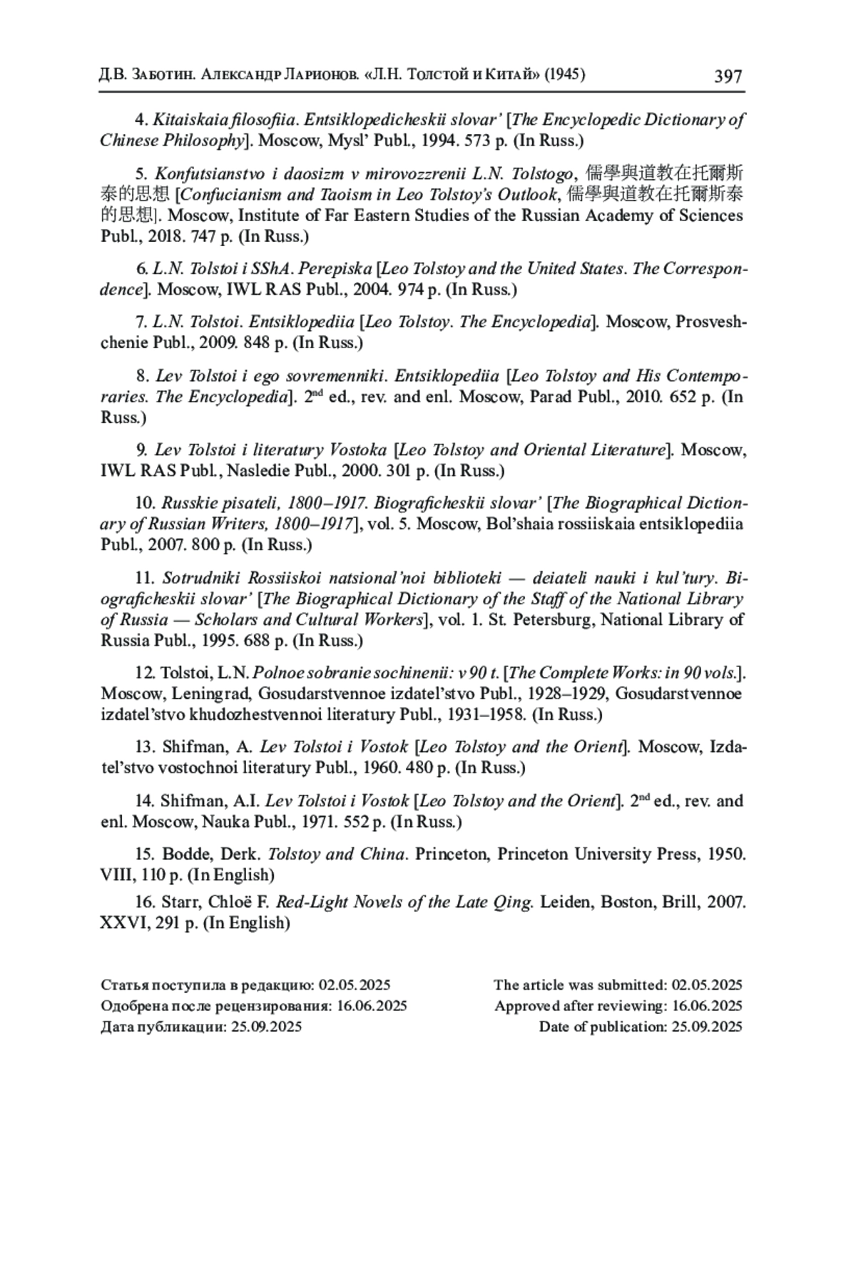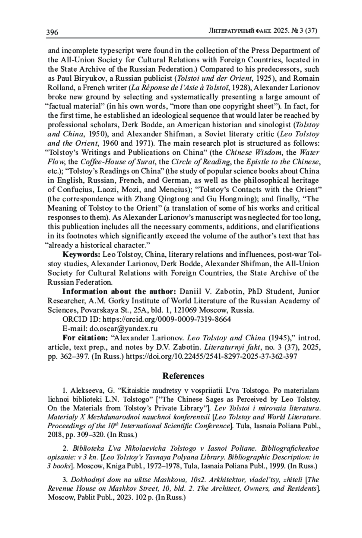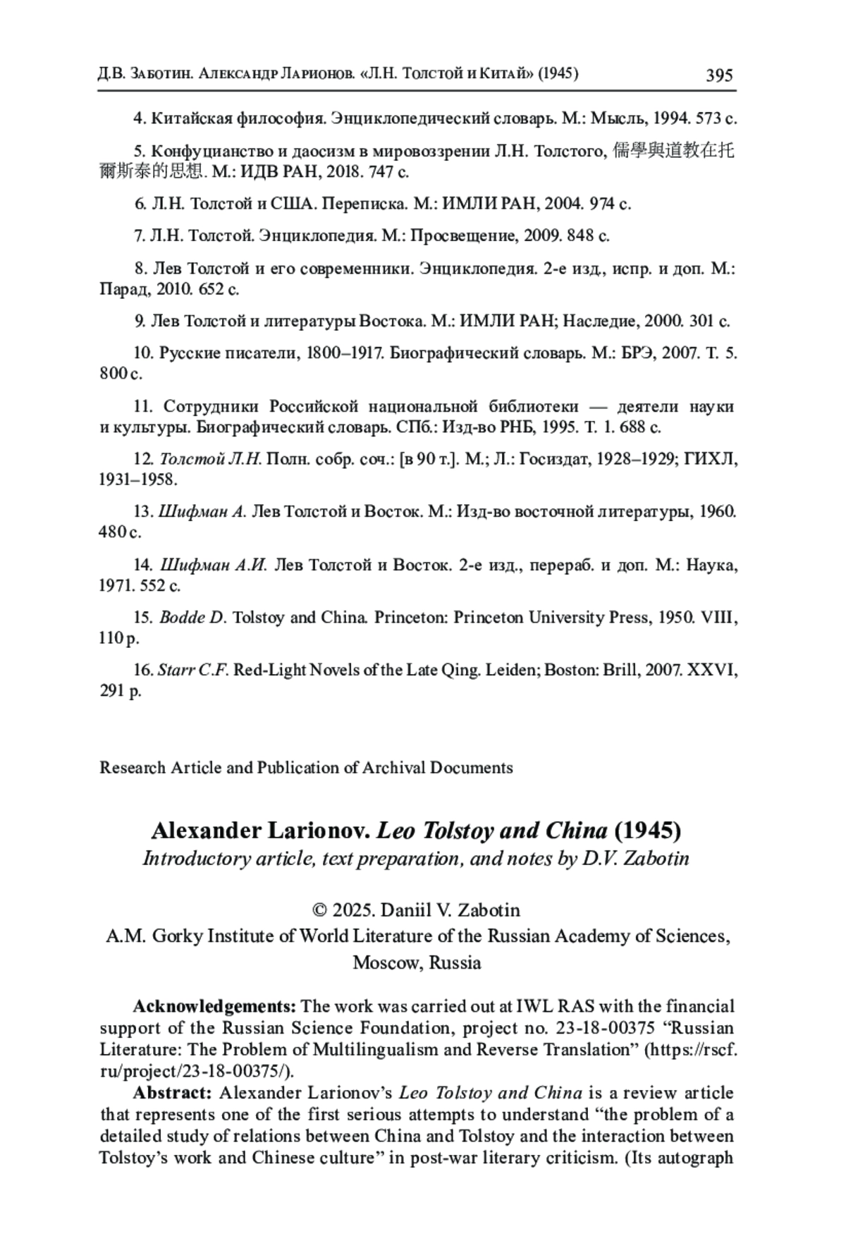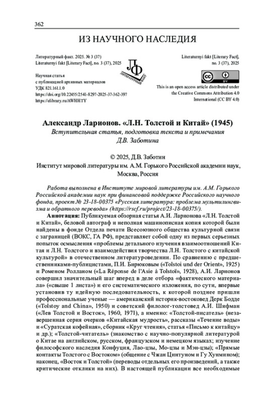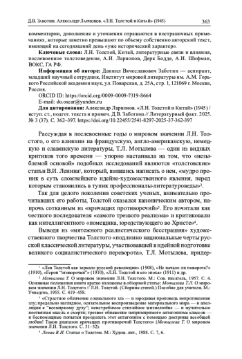 Публикуемая обзорная статья А. И. Ларионова «Л. Н. Толстой и Китай», беловой автограф и неполная машинописная копия которой были найдены в фонде Отдела печати Всесоюзного общества культурной связи с заграницей (ВОКС, ГА РФ), представляет собой одну из первых серьезных попыток осмысления «проблемы детального изучения взаимоотношений Китая и Л. Н. Толстого и взаимодействия творчества Л. Н. Толстого с китайской культурой» в отечественном литературоведении. По сравнению с предшественниками-публицистами, П. И. Бирюковым («Tolstoi und der Orient», 1925) и Роменом Ролланом («La Réponse de l’Asie à Tolstoï», 1928), А. И. Ларионов совершил значительный шаг вперед в деле отбора «фактического материала» («свыше 1 листа») и его систематического изложения, по сути, впервые установив ту идейную последовательность, к которой позднее пришли профессиональные ученые - американский историк-востоковед Дерк Бодде («Tolstoy and China», 1950) и советский филолог-толстовед А. И. Шифман («Лев Толстой и Восток», 1960, 1971), а именно: «Толстой-писатель» (незавершенная серия очерков «Китайская мудрость», рассказы «Течение воды» и «Суратская кофейная», сборник «Круг чтения», статья «Письмо к китайцу» и др.); «Толстой-читатель» (знакомство с научно-популярной литературой о Китае на английском, русском, французском и немецком языках; изучение философского наследия Конфуция, Лао-цзы, Мо-цзы и Мэн-цзы); «Прямые контакты Толстого с Востоком» (общение с Чжан Цинтуном и Гу Хунмином); наконец, «Восток и Толстой» (переводы отдельных его произведений, а также критические отклики на них). В настоящей публикации все необходимые комментарии, дополнения и уточнения отражаются в постраничных примечаниях, которые заметно превышают по объему собственно авторский текст, имеющий на сегодняшний день «уже исторический характер».