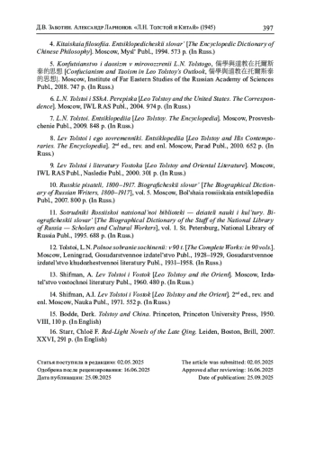 1. Алексеева Г. Китайские мудрецы в восприятии Льва Толстого. (По материалам личной библиотеки Л.Н. Толстого) // Лев Толстой и мировая литература. Материалы X Международной научной конференции. [Тула]: Ясная Поляна, 2018. С. 309-320.