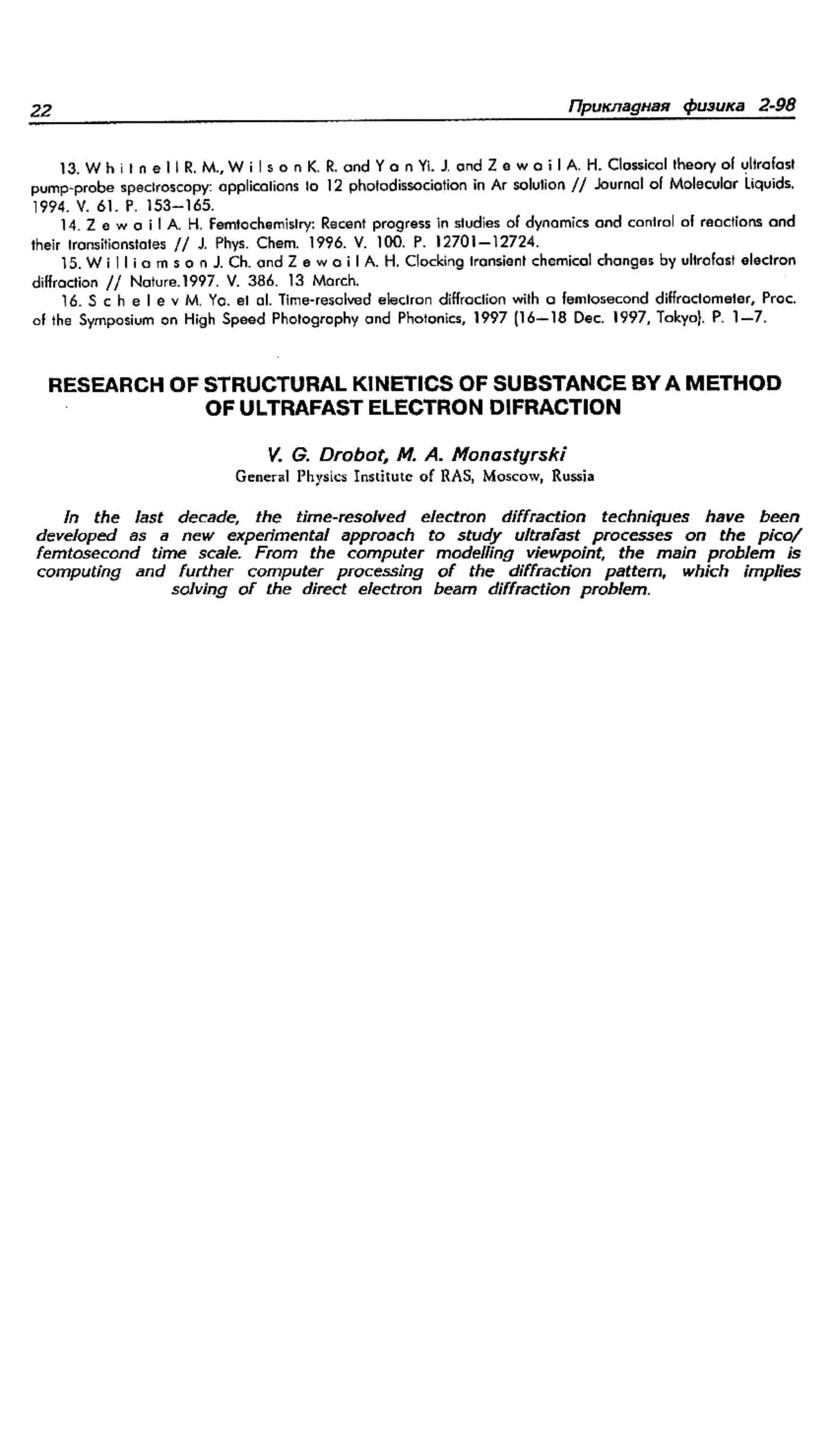 В последнее десятилетие получил развитие метод сверхбыстрой дифракции электронов, являющийся новым и перспективным методом исследования быстропротекающих фемтосекундных явлений. С точки зрения математического моделирования основной проблемой здесь являются расчет и обработка дифракционной картины, полученной от пикофемтосекундного электронного импульса, для чего необходимо решить прямую задачу дифракции реального фемтосекундного пучка на твердотельной и газообразной мишени