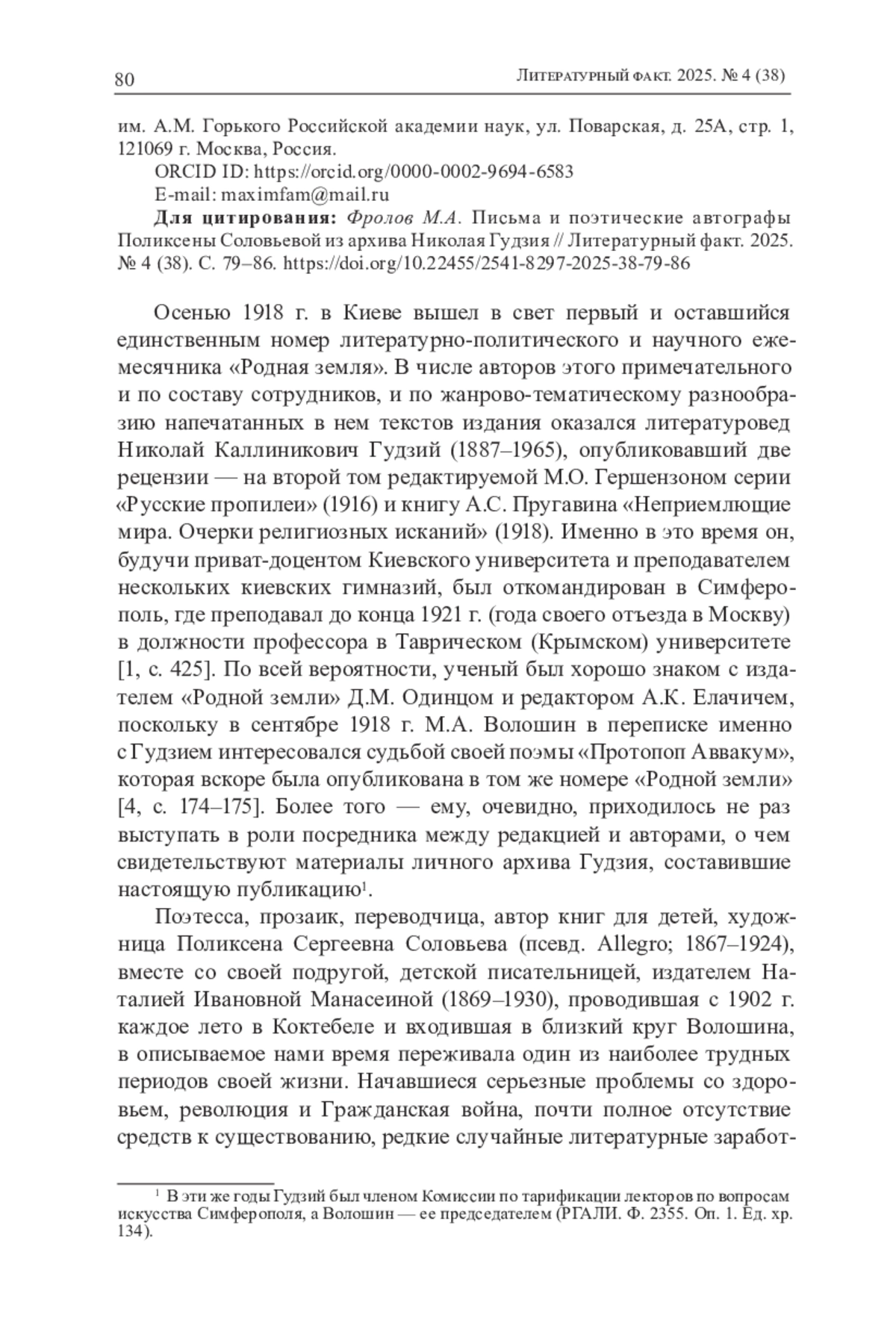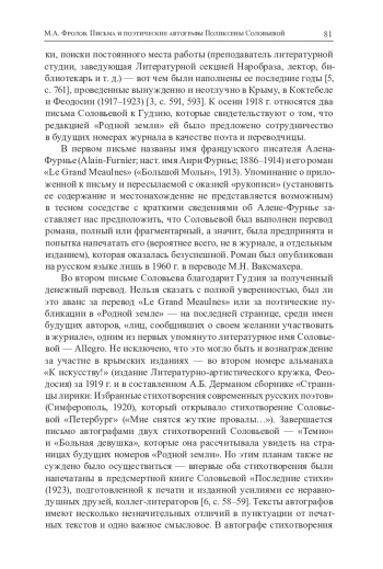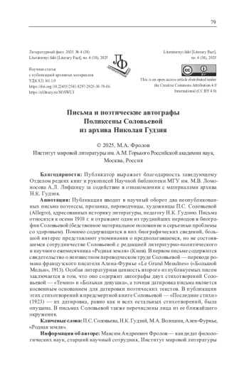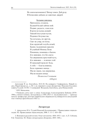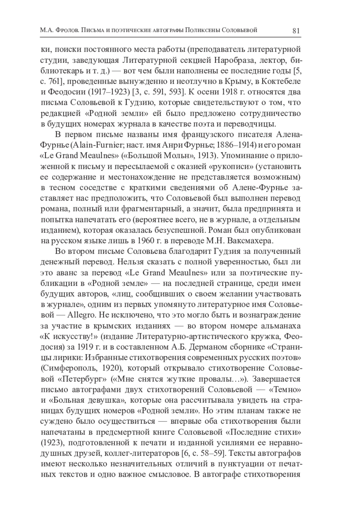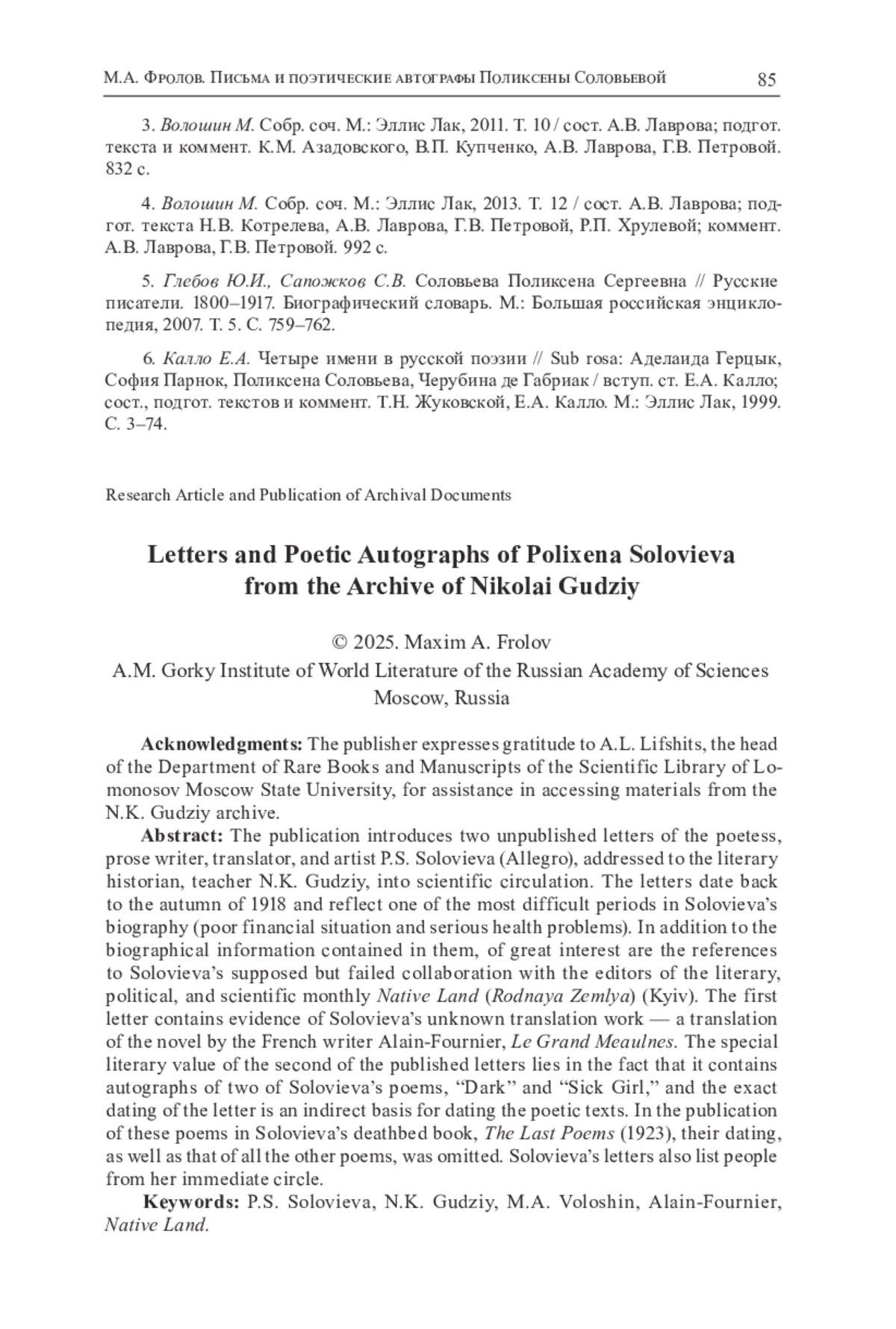 Публикация вводит в научный оборот два неопубликованных письма поэтессы, прозаика, переводчицы, художницы П. С. Соловьевой (Allegro), адресованных историку литературы, педагогу Н. К. Гудзию. Письма относятся к осени 1918 г. и отражают один из труднейших периодов в биографии Соловьевой (бедственное материальное положение и серьезные проблемы со здоровьем). Помимо содержащихся в них биографических сведений, большой интерес представляют упоминания о предполагавшемся, но не состоявшемся сотрудничестве Соловьевой с редакцией литературно-политического и научного ежемесячника «Родная земля» (Киев). В первом письме содержится свидетельство о неизвестном переводческом труде Соловьевой - переводе романа французского писателя Алена-Фурнье «Le Grand Meaulnes» («Большой Мольн», 1913). Особая литературная ценность второго из публикуемых писем заключается в том, что оно содержит автографы двух стихотворений Соловьевой - «Темно» и «Больная девушка», а точная датировка письма является косвенным основанием для датировки поэтических текстов. В публикации этих стихотворений в предсмертной книге Соловьевой - «Последние стихи» (1923) - их датировка, равно как и всех остальных стихотворений, была опущена. В письмах Соловьевой также перечислены лица из ее ближайшего окружения.