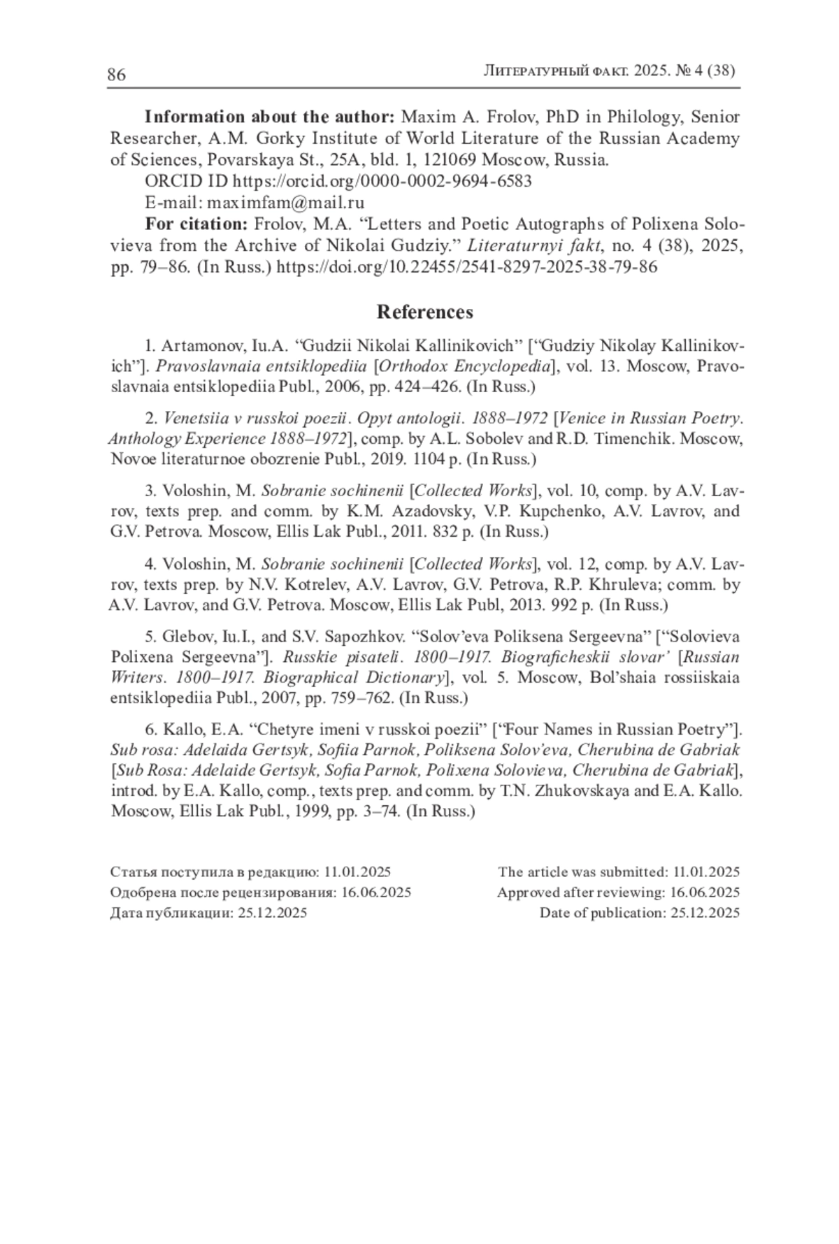 5. Глебов Ю.И., Сапожков С.В. Соловьева Поликсена Сергеевна // Русские писатели. 1800-1917. Биографический словарь. М.: Большая российская энциклопедия, 2007. Т. 5. С. 759-762. EDN: GLKZGS
