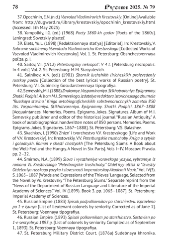 57. Шарифуллина С.В. Поэтическое наследие В.В. Крестовского // Вестник Череповецкого государственного университета. 2010. № 2. С. 51-53.