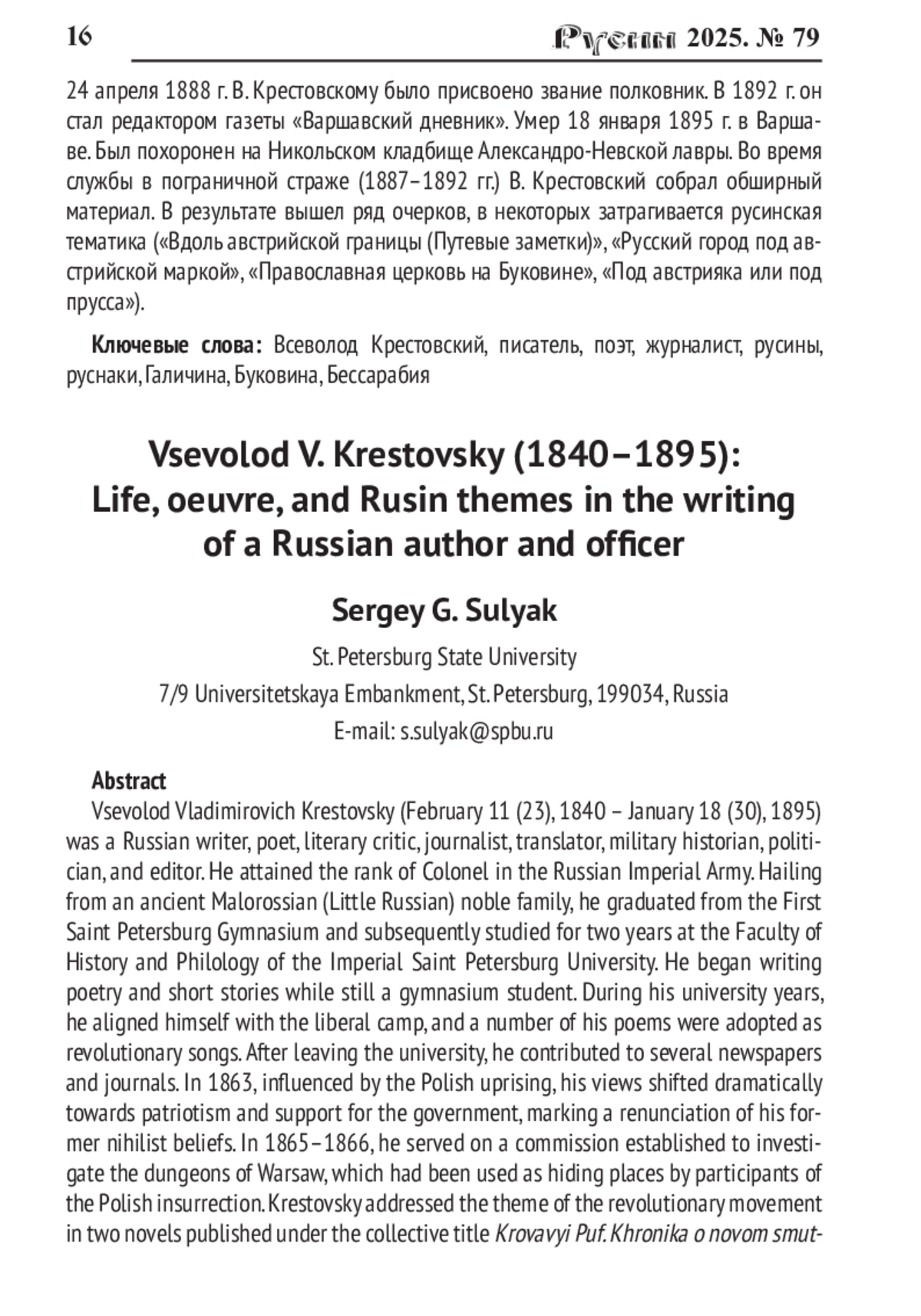 Всеволод Владимирович Крестовский (11 (23).02.1840-18 (30).01.1895) - русский писатель, поэт, литературный критик, журналист, переводчик, военный историк, политик, редактор. Полковник Русской императорской армии. Происходил из старинного малороссийского дворянского рода. Закончил 1-ю Петербургскую гимназию. Отучился два года на историко-филологическом факультете Императорского Санкт-Петербургского университета. Писать стихи и рассказы начал ещё в гимназии. В студенческие годы примкнул к либеральному лагерю. Некоторые его стихотворения стали революционными песнями. Покинув университет, сотрудничал в ряде газет и журналов. В 1863 г. под влиянием Польского восстания перешёл в патриотический проправительственный лагерь, отказавшись от нигилистических воззрений. В 1865-1866 гг. он стал членом комиссии, учреждённой для исследования подземелий Варшавы. В них скрывались участники польского мятежа. Теме революционного движения посвятил два романа, вышедшие под общим названием «Кровавый пуф. Хроника о новом смутном времени Государства Российского» (Т. 1-4. СПб., 1875). В 1858 г. у Крестовского родился замысел написать роман «Петербургские трущобы». Роман публиковался в «Отечественных записках» в 1864-1866 гг. Отдельным изданием вышел в 1867 г. Роман имел огромный успех. В 1868 г. писатель поступает унтер-офицером в 14-й уланский Ямбурский полк. Создает ряд произведений на военно-историческую тематику. Участвует в Русско-турецкой войне 1876-1877 гг. Пишет трилогию «Тьма египетская», «Тамара Бендавид» и «Торжество Ваала», которая публиковалась в «Русском вестнике» в 1881-1891 гг. В третьей, неоконченной части «Торжество Ваала» содержится пророческое предостережение о том, что противники самодержавия меняют тактику и вместо «хождения в народ» начинают «идти в правительство». 24 апреля 1888 г. В. Крестовскому было присвоено звание полковник. В 1892 г. он стал редактором газеты «Варшавский дневник». Умер 18 января 1895 г. в Варшаве. Был похоронен на Никольском кладбище Александро-Невской лавры. Во время службы в пограничной страже (1887-1892 гг.) В. Крестовский собрал обширный материал. В результате вышел ряд очерков, в некоторых затрагивается русинская тематика («Вдоль австрийской границы (Путевые заметки)», «Русский город под австрийской маркой», «Православная церковь на Буковине», «Под австрияка или под прусса»).