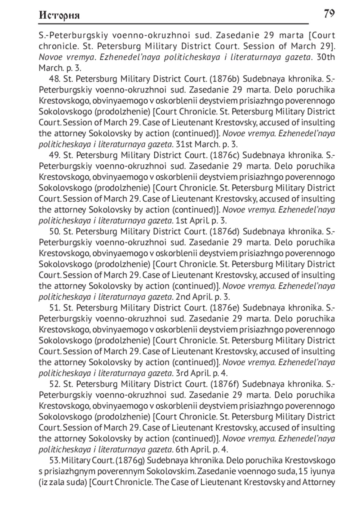 52. Судебная хроника. С.-Петербургский военно-окружной суд. Заседание 29 марта. Дело поручика Крестовского, обвиняемого в оскорблении действием присяжного поверенного Соколовского (окончание) // Новое время. Еженедельная политическая и литературная газета. 1876. № 36. Вторник, 6 апреля. С. 4.