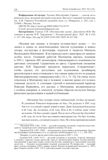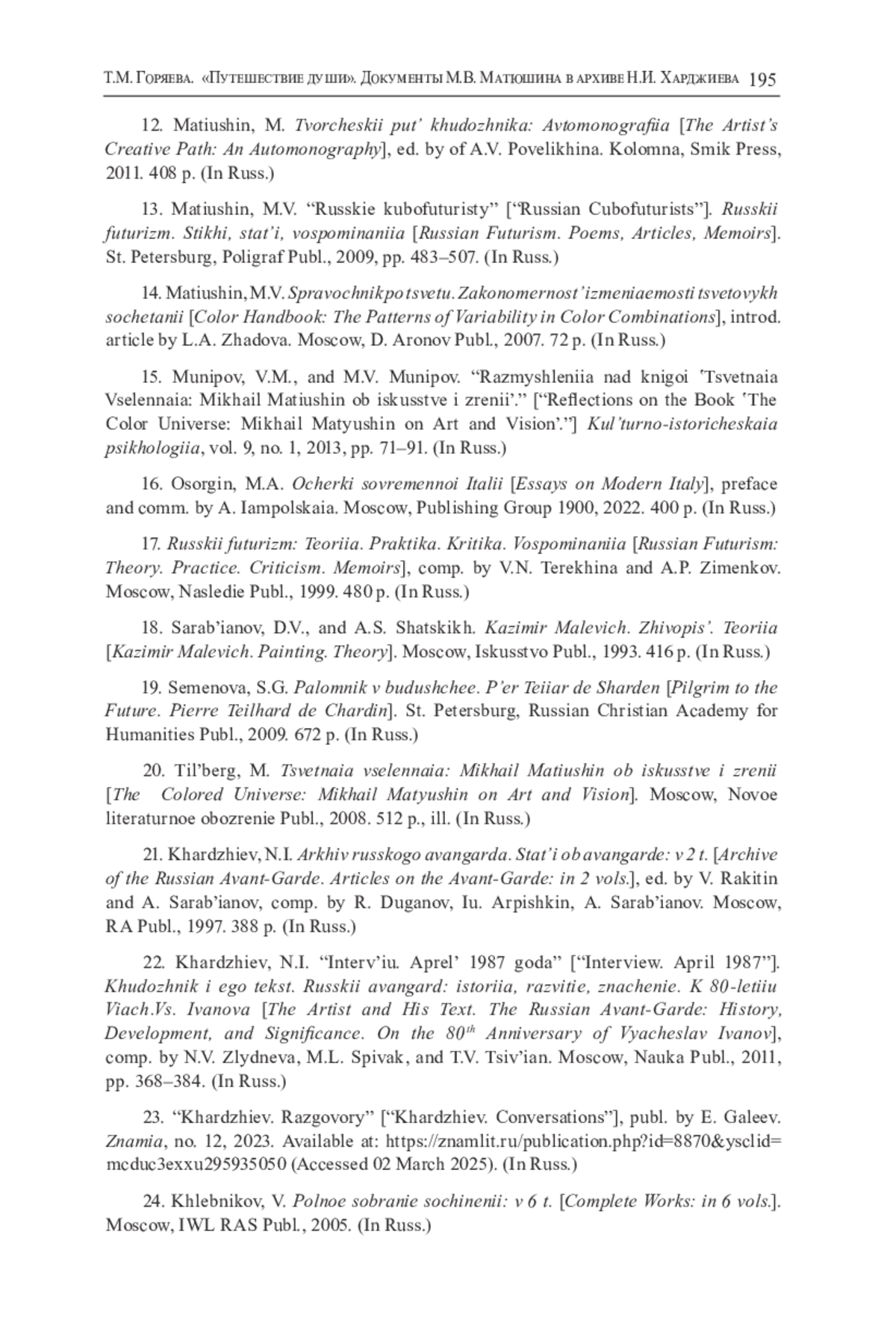 2. Горяева Т.М. Коллекционирование как научно-исследовательский метод: к анализу модели архивной части коллекций Н.И. Харджиева и И.С. Зильберштейна // Experiment. 2024. Vol. 30. P. 135-164. EDN: FWAFCS