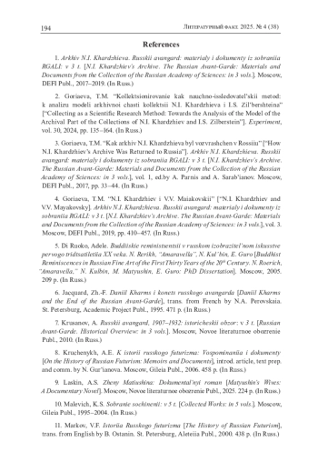 1. Архив Н.И. Харджиева. Русский авангард: материалы и документы из собрания РГАЛИ: в 3 т. М.: Дэфи, 2017-2019.