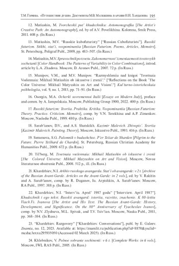 15. Мунипов В.М., Мунипов М.В. Размышления над книгой “Цветная Вселенная: Михаил Матюшин об искусстве и зрении” // Культурно-историческая психология. 2013. Т. 9. № 1. С. 71-91. EDN: RZTZDF