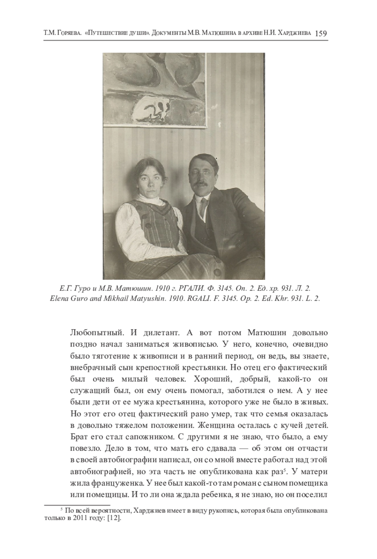 В публикацию включены теоретические эссе М. В. Матюшина и его переписка с Н. Н. Асеевым, Д. Д. Бурлюком, В. В. Хлебниковым, Р. О. Якобсоном, а также черновик трактата К. С. Малевича «Супрематизм. Мир как беспредметность, или Вечный покой» с завещательным обращением к Матюшину. Такой отбор обусловлен хронологическим периодом 1910-1916 гг., отмеченным наиболее значимыми событиями в жизни Матюшина: сближение с поэтами и художниками-футуристами - Д. Д. и В. Д. Бурлюками, В. В. Ка менск и м, В. В. Х лебн и ковы м, а та к же Вя ч. И. И ва новы м, А. М. Ремизовым, Ф. К. Сологубом, развитие теоретического направления под влиянием Н. О. Лосского и П. Д. Успенского идей «четвертого измерения» и «расширенного смотрения» в понимании единства мира, появление «медитационных» пейзажей. Именно этот период обозначен главным творческим прорывом Матюшина - написанием музыки для оперы «Победа над Солнцем» (пролог В. В. Хлебникова, либретто А. Е. Крученых, костюмы и декорации К. С. Малевича. 1913) как части трилогии - «Победа над Солнцем», «Победа над войной», «Победа над империализмом» и созданием трагедии «Владимир Маяковский». Осуществлялась им в этот период и интенсивная издательская деятельность (издательство «Журавель», выпустившее до 1917 г. двадцать книг, брошюр и сборников), а также инициировалось создание общества «Союз молодежи». Безусловно, все эти открытия и новации, о которых говорится в публикуемых документах, осуществлялись совместно с Еленой Гуро вплоть до ее смерти, и, как утверждал Матюшин, впоследствии он не терял с ней духовную связь.
