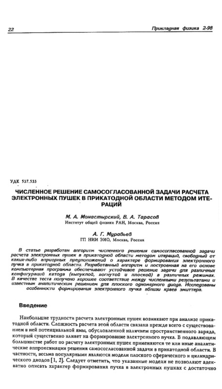 В статье разработан алгоритм численного решения самосогласованной задачи расчета электронных пушек в прикатодной области методом итераций, свободный от каких-либо априорных предположений о характере формирования электронного пучка в прикатодной области. Разработанный алгоритм и построенная на его основе компьютерная программа обеспечивают устойчивое решение задачи для различных конфигураций катода (выпуклой, вогнутой и плоской) в различных режимах. В качестве теста получено хорошее соответствие между численными результатами и известным аналитическим решением для плоского одномерного диода. Исследованы особенности формирования электронного пучка вблизи краев эмиттера.