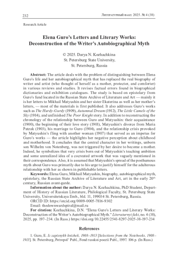 Статья посвящена проблеме разграничения писательницы и художницы Елены Гуро и автобиографического мифа (репрезентации себя как матери-созидательницы-заступницы), заместившего ее реальный облик в критических и научных работах. Мы указываем на ряд фактических ошибок в изложении биографии писательницы в специализированных словарях и тематических каталогах. Опираясь на материалы из фонда Гуро в РГАЛИ, многие из которых привлекаются впервые (письма к художнику и музыканту Михаилу Матюшину, к сестре Екатерине и послания от матери Гуро), мы исследуем негативное восприятие писательницей детства и материнства, связанное с фиксацией на творчестве, а также восстанавливаем историю взаимоотношений Гуро и Матюшина, датируя и комментируя такие важные этапы, как начало их близкого общения (1901 г.), бракоразводный процесс Матюшина с Марией Патцак (1903 г.), женитьба на Гуро (1904 г.) и кризис семейной жизни (1907 г.), послуживший основным импульсом творчества Гуро. В статье исследуются тексты из книг «Шарманка», «Осенний сон», «Небесные верблюжата», а также неоконченная повесть «Бедный рыцарь». Сопоставление эпистолярного и художественного наследия писательницы позволяет нам сделать вывод о том, что центральный для творчества Гуро образ «бесплотного» сына появился не как компенсация несостоявшегося материнства, но как следствие кризиса ее отношений с Матюшиным, возникших благодаря педагогическим амбициям художника и некоему невоплощенному творческому замыслу, на который в письмах Гуро даются только неясные намеки. Развитие Матюшиным посмертного мифа о Гуро связывается с желанием художника оправдать его сближение с писательницей, быстро обретшее форму адюльтера и сопровождавшееся сложным бракоразводным процессом с первой женой.
