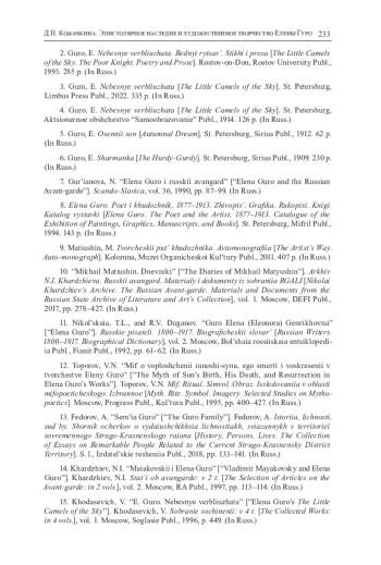 14. Харджиев Н.И. Маяковский и Елена Гуро // Харджиев Н.И. Статьи об авангарде: в 2 т. М.: RA, 1997. Т. 2. С. 113-114.
