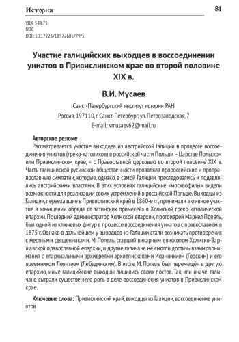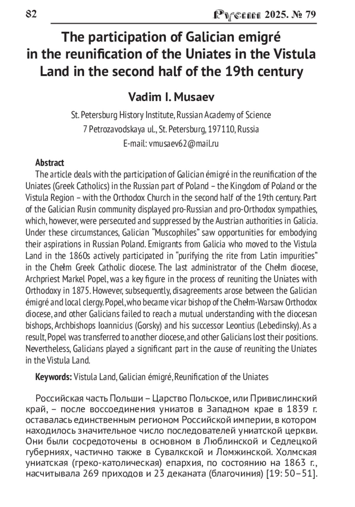 Рассматривается участие выходцев из австрийской Галиции в процессе воссоединения униатов (греко-католиков) в российской части Польши - Царстве Польском или Привислинском крае, - с Православной церковью во второй половине XIX в. Часть галицийской русинской общественности проявляла пророссийские и проправославные симпатии, которые, однако, в самой Галиции преследовались и подавлялись австрийскими властями. В этих условиях галицийские «москвофилы» видели возможности для реализации своих устремлений в российской Польше. Выходцы из Галиции, переехавшие в Привислинский край в 1860-е гг., принимали активное участие в «очищении обряда от латинских примесей» в Холмской греко-католической епархии. Последний администратор Холмской епархии, протоиерей Маркел Попель, был одной из ключевых фигур в процессе воссоединения униатов с православием в 1875 г. Однако в дальнейшем у выходцев из Галиции стали возникать противоречия с местными священниками. М. Попель, ставший викарным епископом Холмско-Варшавской православной епархии, и другие галичане не смогли достичь взаимопонимания с епархиальными архиереями архиепископами Иоанникием (Горским) и его преемником Леонтием (Лебединским). В итоге М. Попель был перемещён в другую епархию, иные галицийские выходцы лишились своих постов. Так или иначе, галичане сыграли существенную роль в деле воссоединения униатов в Привислинском крае.