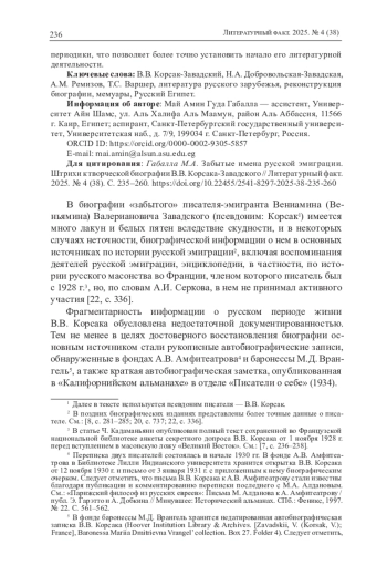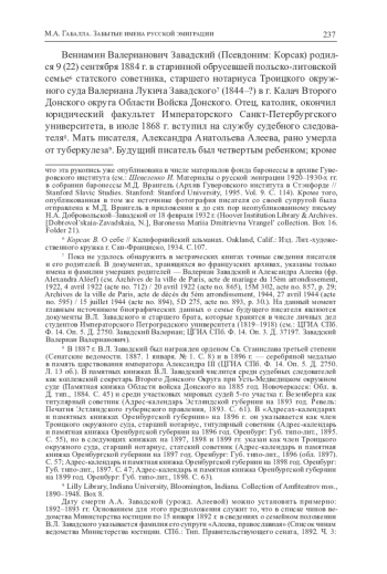 В целях восполнения этих лакун представлены результаты разыскания и изучения материалов по биографии и творчеству писателя и его супруги Н. А. Добровольской-Завадской в российских и зарубежных архивохранилищах (ГА РФ, ЦГИА СПб, Бахметевский архив, архивы Амхерстского колледжа, Гуверовского института и Центра Гетти, библиотека Лилли, национальные архивы Франции). В статье впервые в научный оборот вводятся архивные документы, касающиеся довоенного периода в биографии В. В. Корсака, а также часть его переписки, хранящейся в фондах А. М. Ремизова, А. В. Амфитеатрова и Т. С. Варшер. Кроме того, затрагиваются эпизоды из эмигрантской жизни писателя (в Египте, Франции, Италии, Эстонии) и его литературные связи с представителями центров русской диаспоры. Сделана попытка составить полную библиографию публикаций В. В. Корсака на страницах эмигрантской периодики, что позволяет более точно установить начало его литературной деятельности.