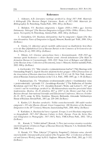 2. Беляков В.В. Русская эмиграция в Египте (1920-е-1980-е гг.): История. Документы. Некрополь. СПб.: Алетейя, 2018. 264 с. EDN: YNQVLQ