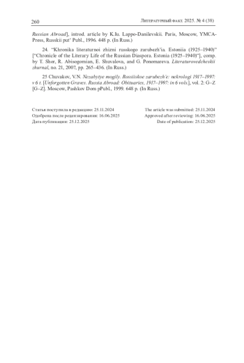 25. Чуваков В.Н. Незабытые могилы. Российское зарубежье: некрологи 1917-1997: в 6 т. М.: Пашков дом, 1999. Т. 2: Г-З. 648 с.