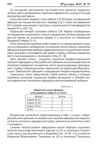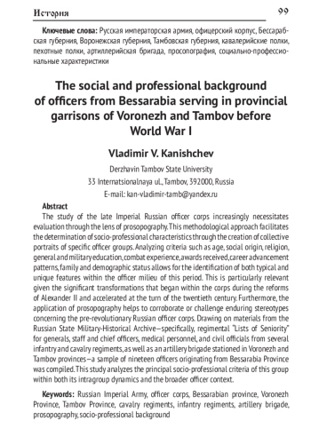 В вопросах исследования офицерского корпуса позднеимперского периода всё чаще возникает необходимость его оценки посредством метода просопографии, позволяющего путём создания коллективных портретов той или иной группы офицеров определять их социально-профессиональные характеристики. Анализ показателей возраста, социального происхождения, вероисповедания, уровня общего и военного образования, наличия боевого опыта, количества наград, получения званий за выслугу лет и боевые отличия, а также семейно-демографического положения позволяет выявлять типичные и уникальные черты офицерской среды в рассматриваемый период. Особенно актуальным это становится в контексте серьезных изменений, которые начали происходить в офицерском корпусе в период реформ Александра II и приобрели ещё больший размах на рубеже XIX-XX вв. Кроме того, использование данного метода позволяет подтвердить или опровергнуть некоторые стереотипы, сложившиеся в отношении офицерского корпуса дореволюционной России. На материалах Российского государственного военно-исторического архива путём исследования полковых «Списков (по старшинству) генералам, штаб и обер-офицерам, врачам и классным чиновникам» нескольких пехотных и кавалерийских полков, а также артиллерийской бригады, дислоцированных в Воронежской и Тамбовской губерниях, была сформирована выборка из 19 офицеров, представлявших Бессарабскую губернию. Анализируются основные социально-профессиональные критерии данной выборки во внутригрупповом и общеофицерском контексте.