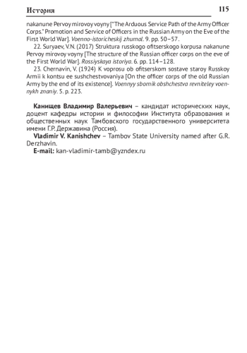 22. Суряев В.Н. Структура русского офицерского корпуса накануне Первой мировой войны // Российская история. 2017. № 6. С. 114-128.